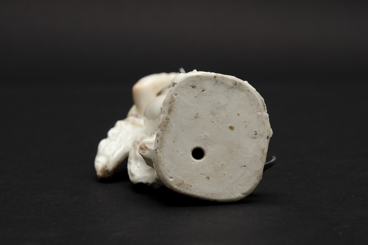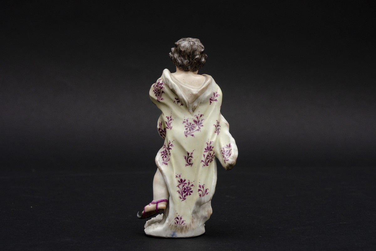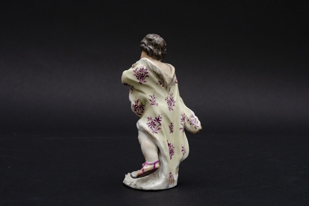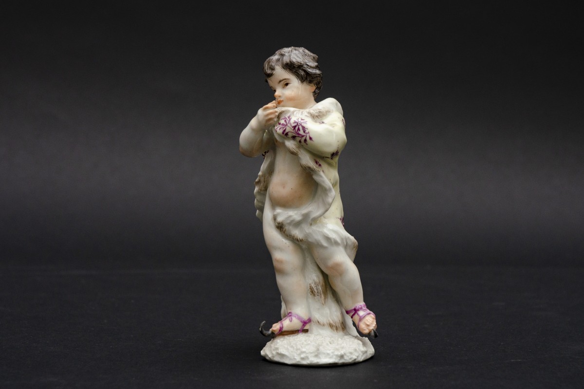 Magnifique putto soufflant dans ses mains pour se réchauffer tout en patinant. Allégorie de l’hiver, fait partie du groupe des 4 saisons modelé par Kaendler en 1764. Cette pièce est d’époque. Marquée au dos. Superbe qualité et très bel état.