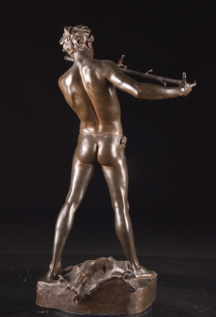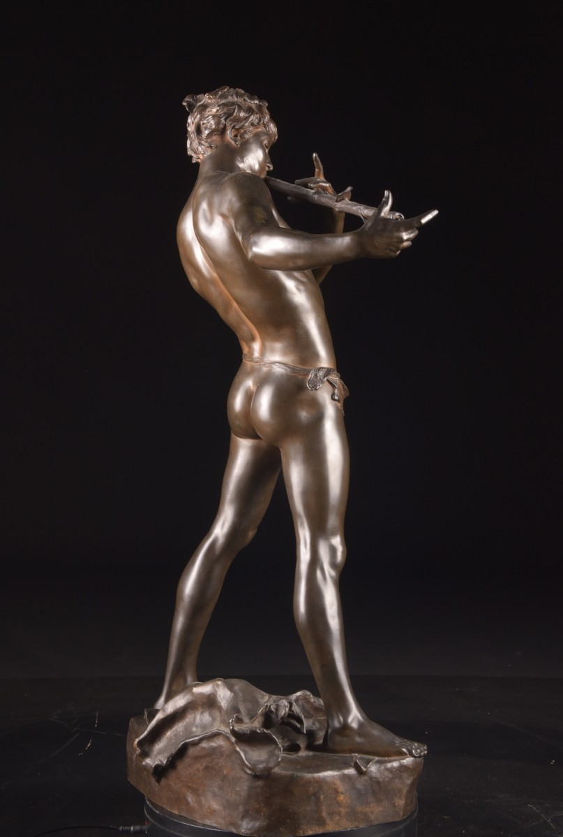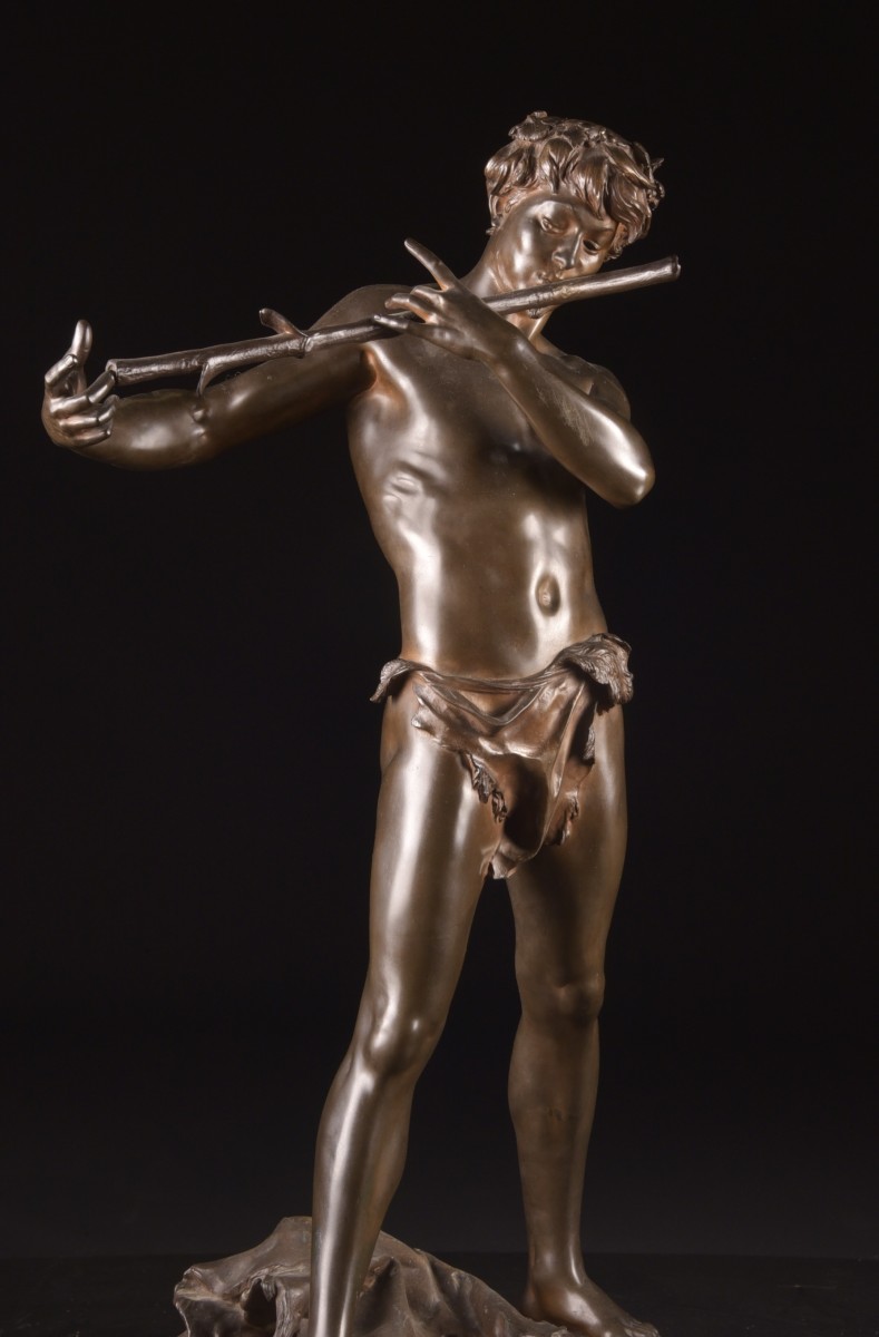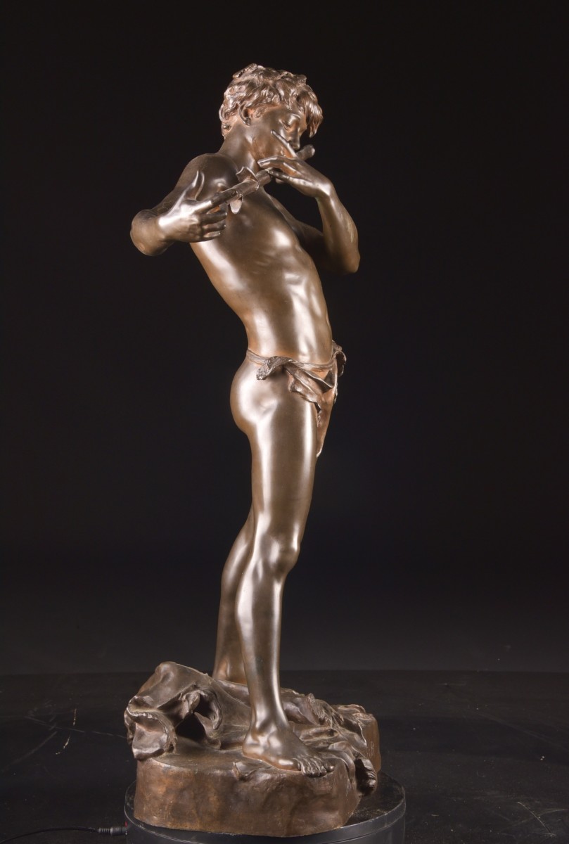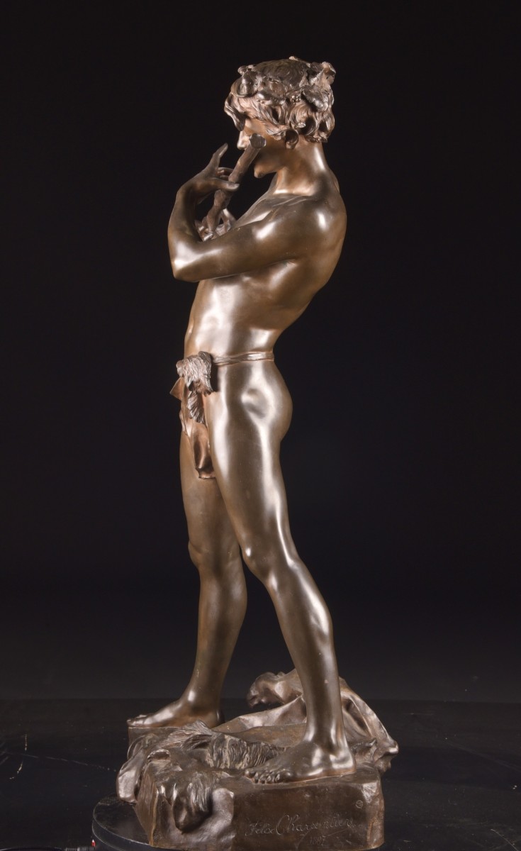 Sculpture en bronze à patine brune réalisée par le sculpteur français Félix Maurice Charpentier (1858–1924), représentant « L’Improvisateur ». La figure évoque un jeune homme jouant d’une flûte traversière improvisée à partir d’une branche, saisi dans un instant de spontanéité et de grâce naturelle.