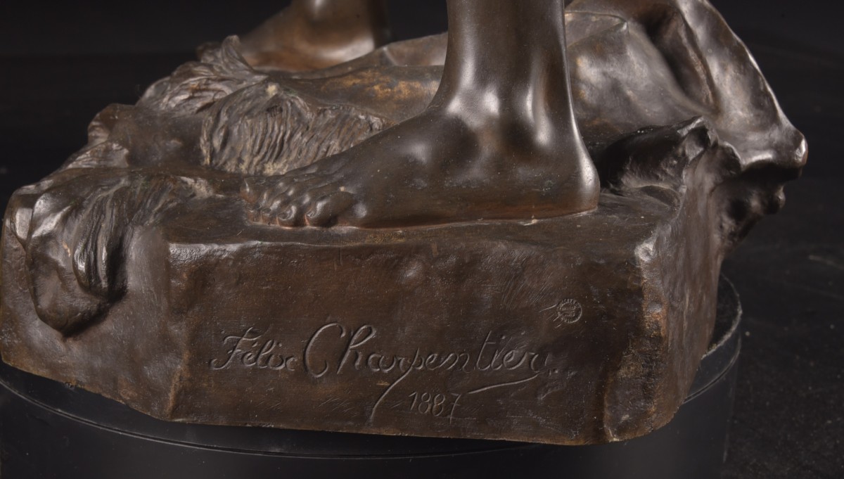 Le bronze est signé “Félix Charpentier” et daté 1887, et porte le cachet de la prestigieuse Société des Bronzes de Paris, attestant d’une fonte parisienne de grande qualité.