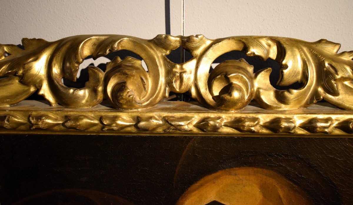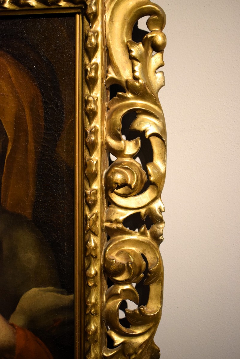 La toile est en excellent état, rentoilée au XIXe siècle, et présentée dans un magnifique cadre sculpté et doré, typique de l'Émilie du XVIIe siècle.