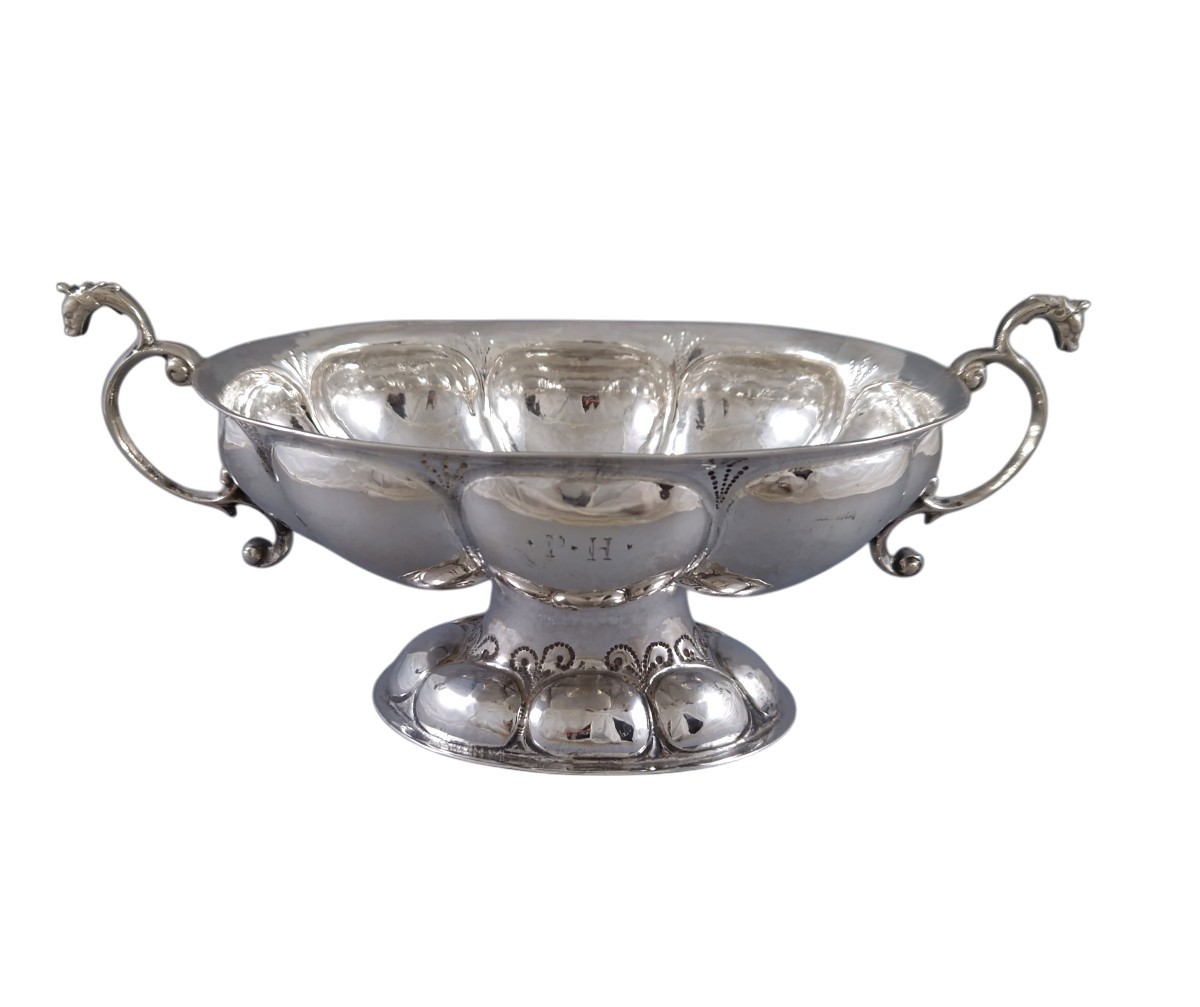De forme ovale, elle repose sur un piédouche à décor de godrons, décor en rappel sur le corps, les anses en forme de dragons.
