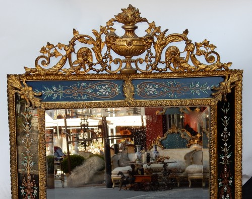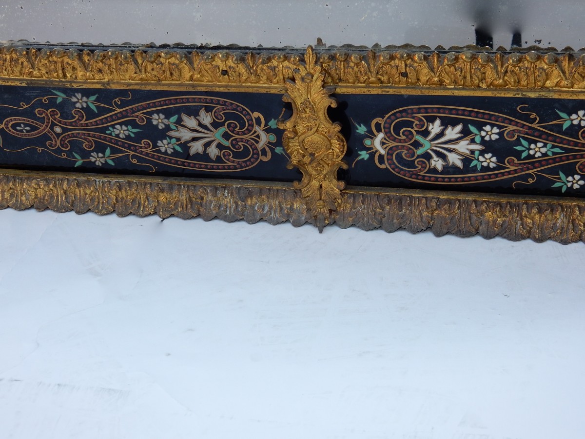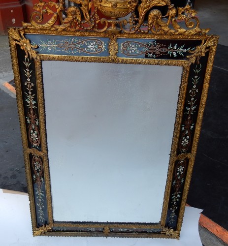 Miroir Venise rectangulaire tain argentique,orné de bronze doré, le centre est biseauté,quelques petites taches, les plaques en verre a fond noir sont émaillées en couleur et en relief, bon état, circa 1880/1900 sans fronton, H: 114