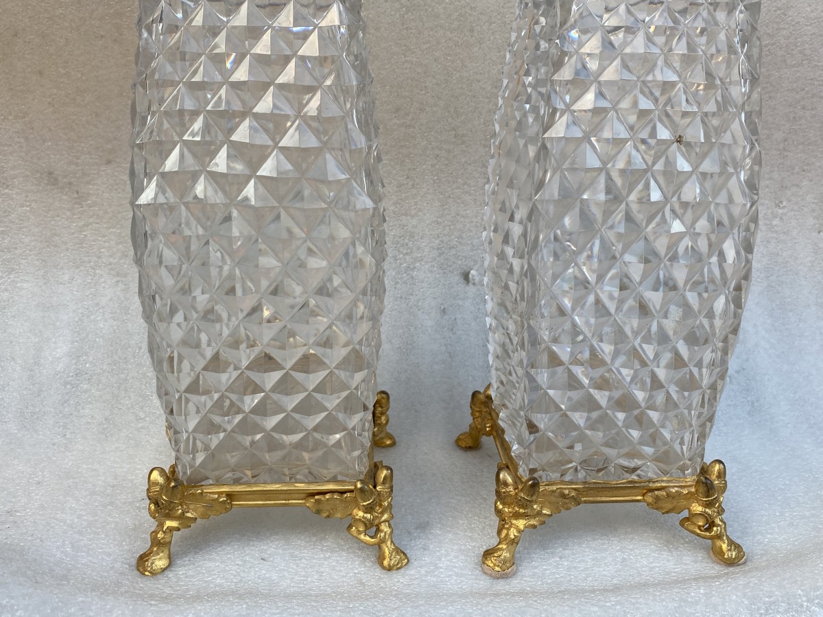 Paire de vases en cristal pointe de diamants avec un socle en bronze doré a decor de glands et feuilles de chéne.