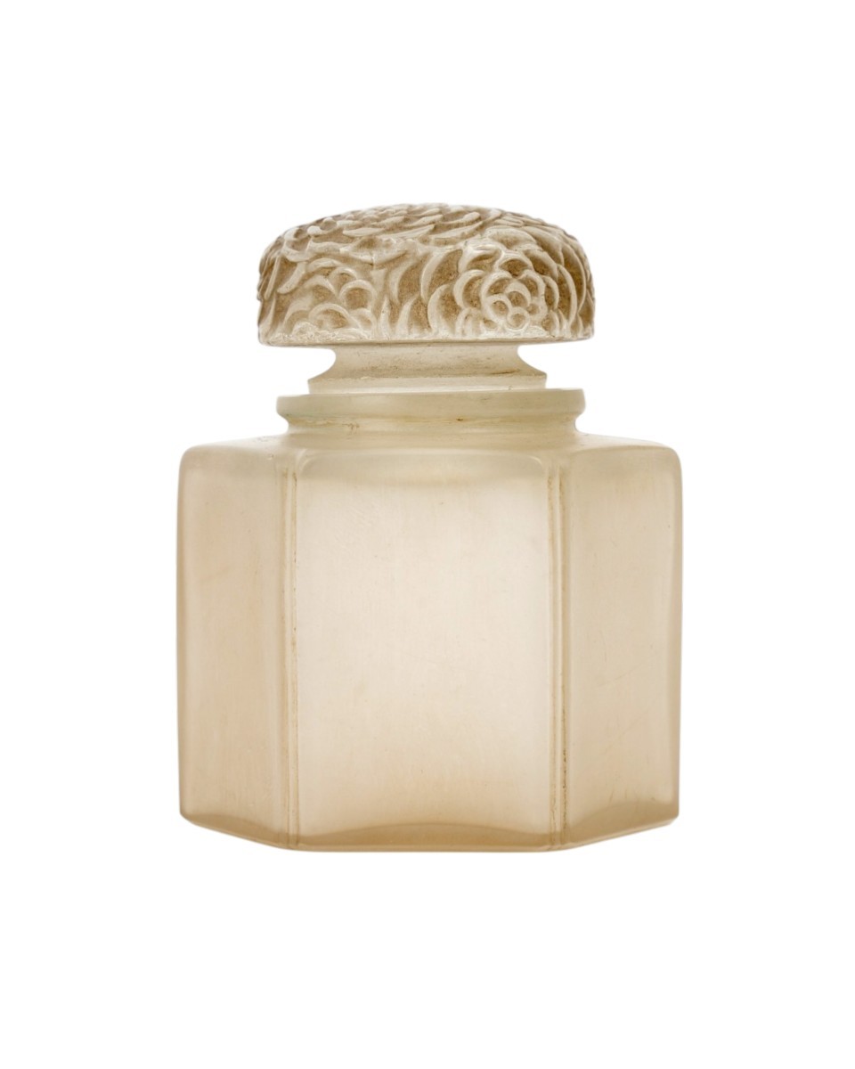 Boîte Pot à Crème "Chrysanthème" en verre blanc patiné sépia de René Lalique créé en 1913.