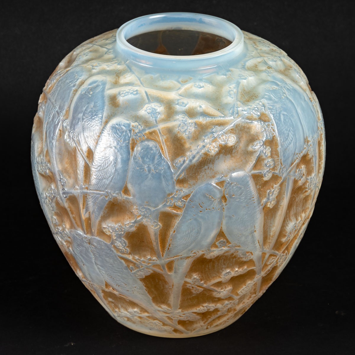 Vase "Perruches" en verre opalescent double couche patiné sépia de René LALIQUE créé en 1919.