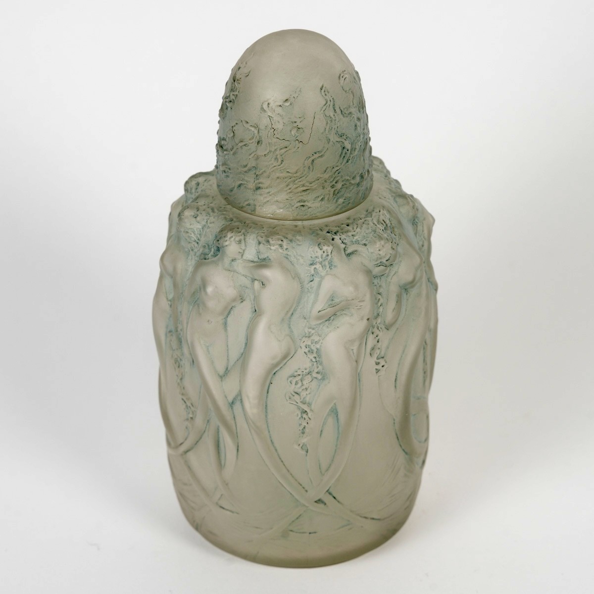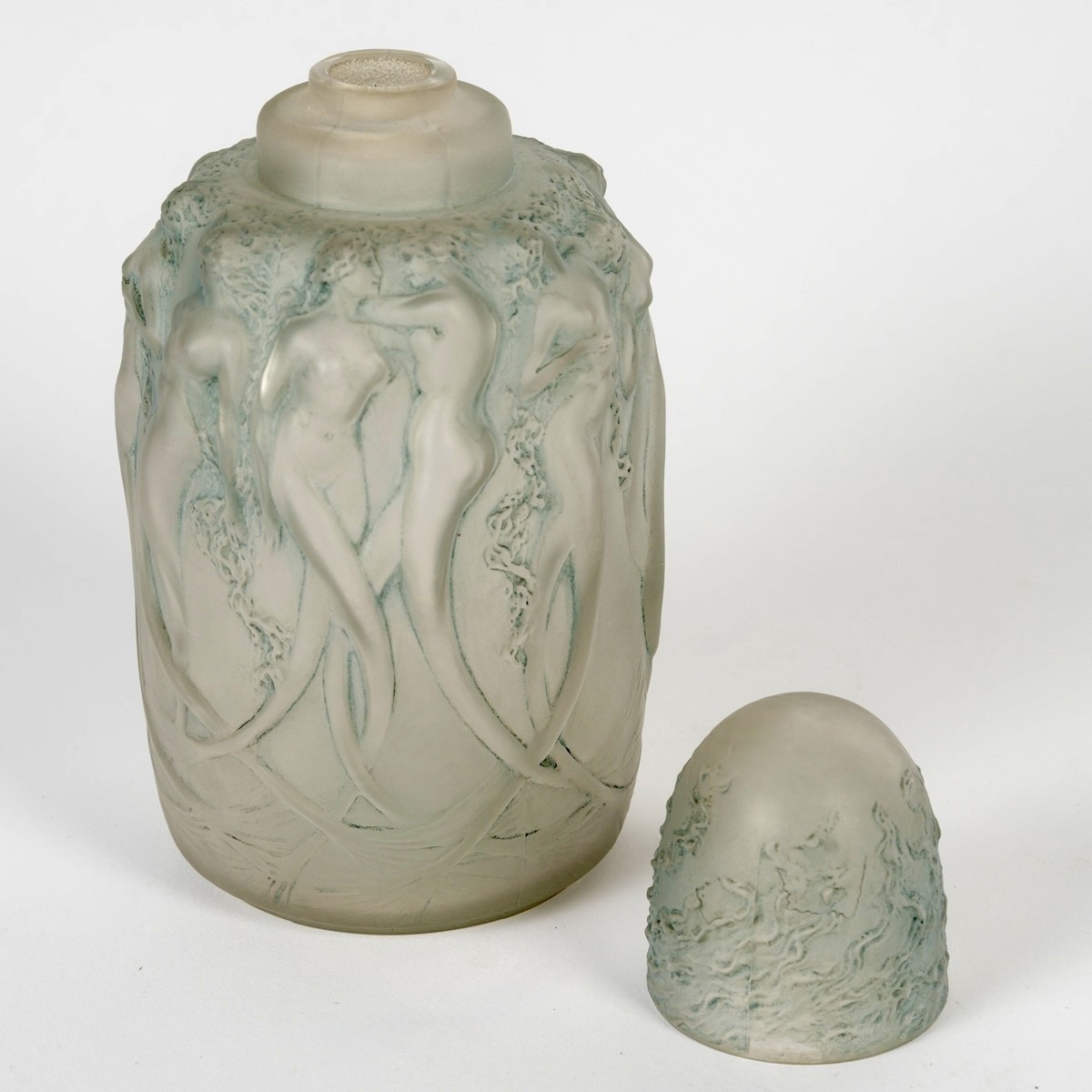 Brûle Parfums "Sirènes" en verre blanc patiné bleu de René Lalique créé en 1920.