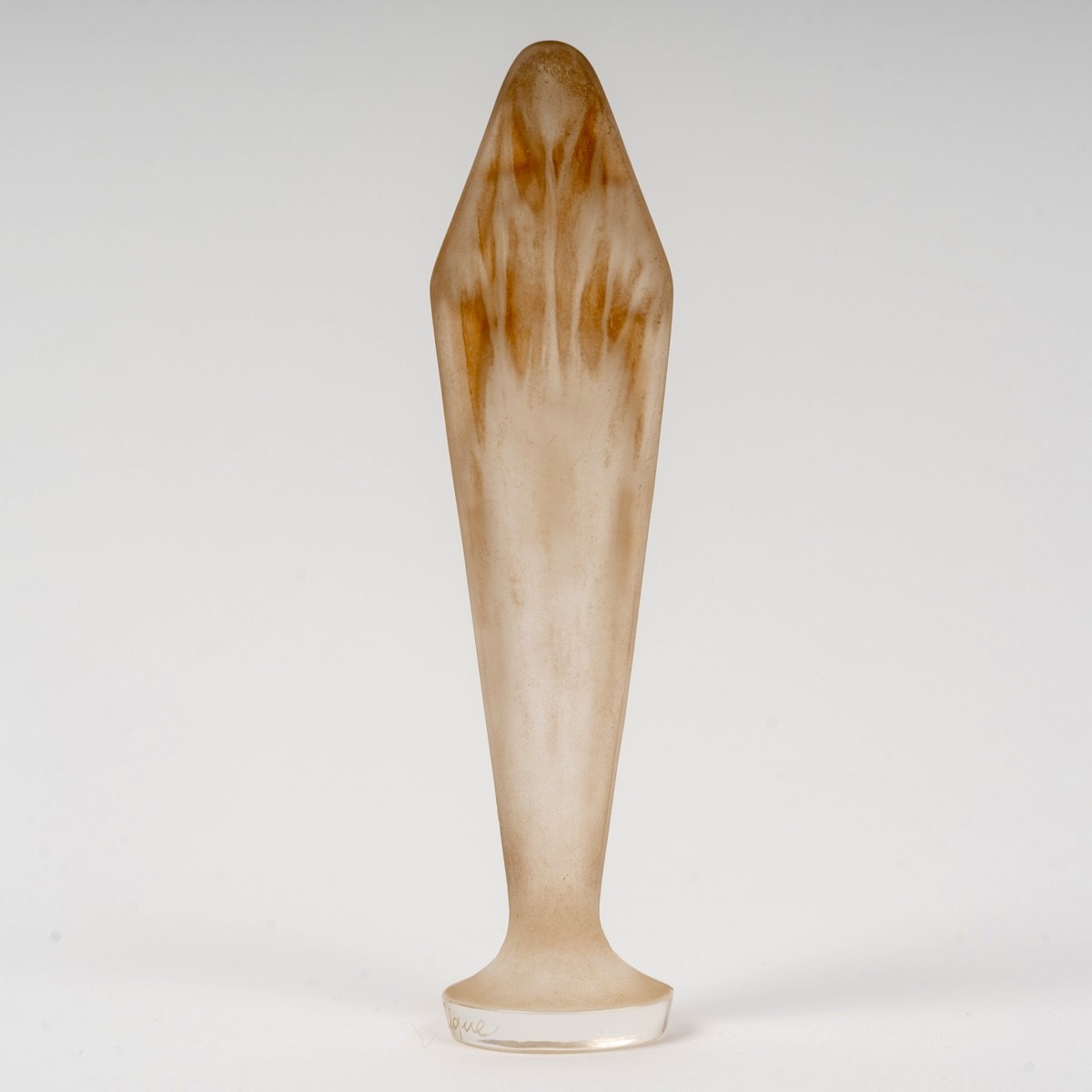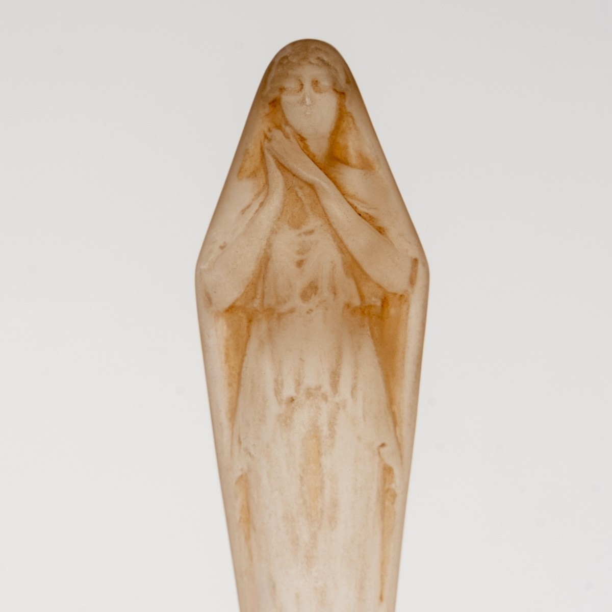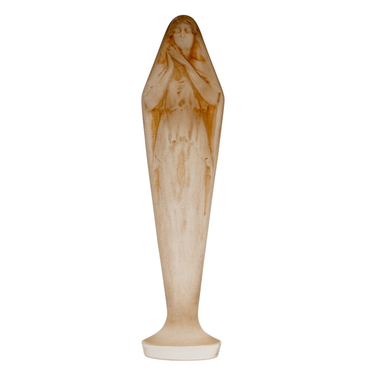 Cachet "Figurine Mains Jointes" en verre blanc patiné sépia de René Lalique créé en 1920.