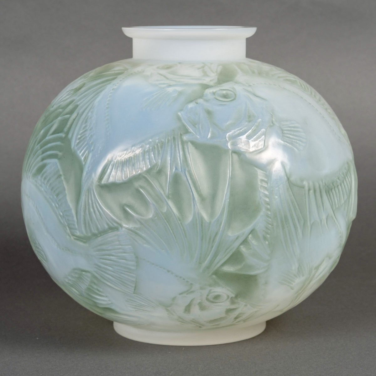 Vase "Poissons" en verre opalescent multicouche patiné vert de René Lalique créé en 1921.