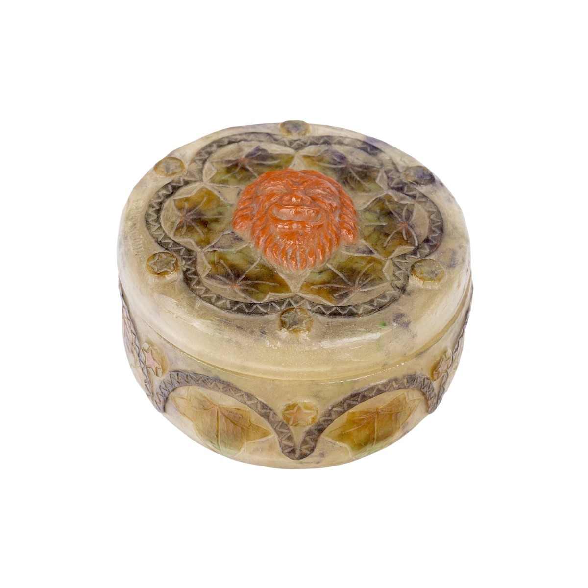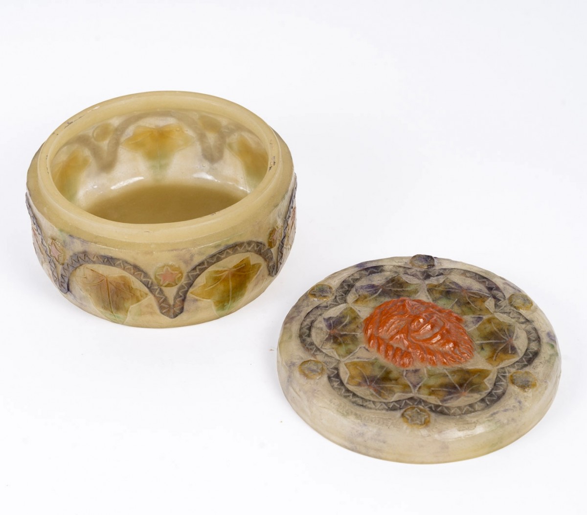 Boîte "Masques" en pâte de verre marbrée, verte, rouge et jaune de Gabriel Argy-Rousseau créée en 1923.