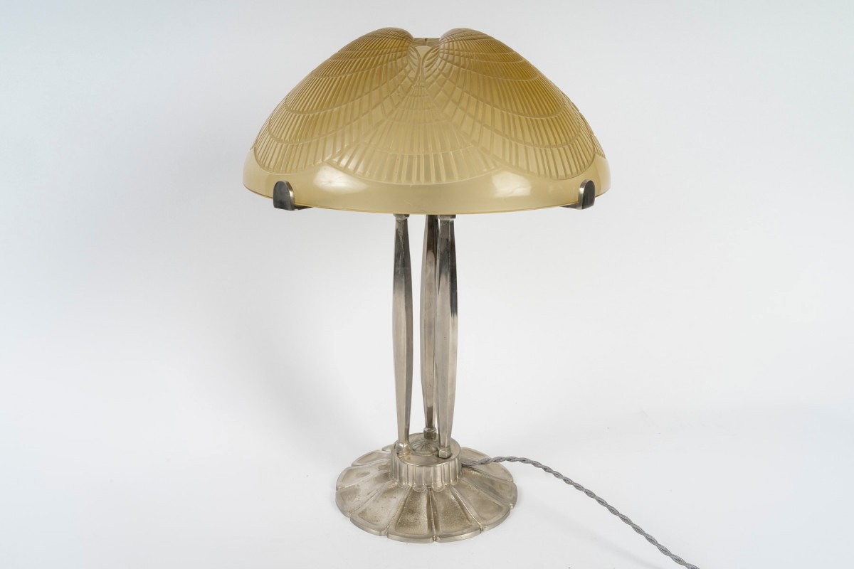 Montée sur un pied de style Art-Déco en bronze nickelé.