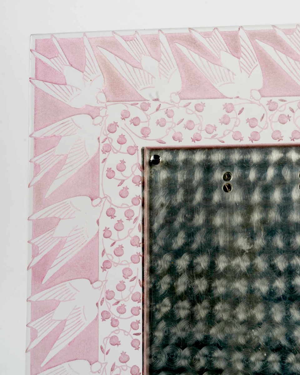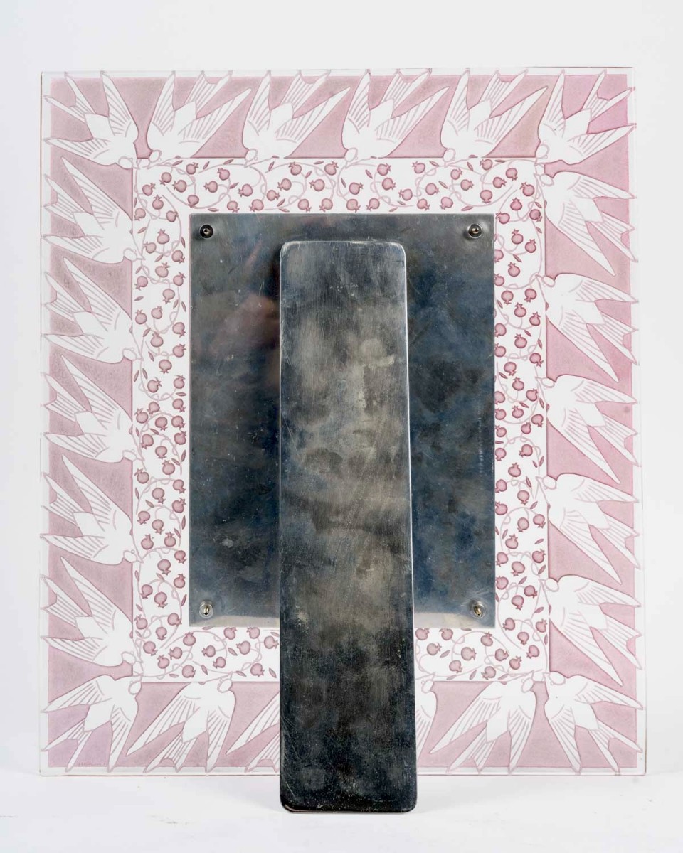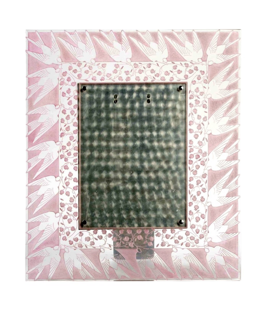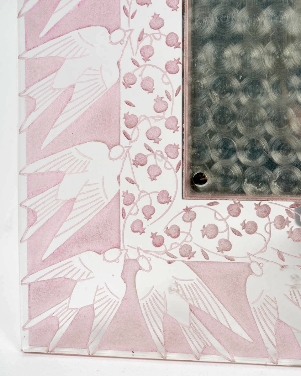 Cadre "Muguet et Hirondelles" en verre blanc patiné rose de René Lalique créé en 1926.