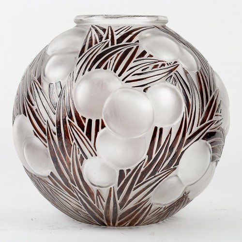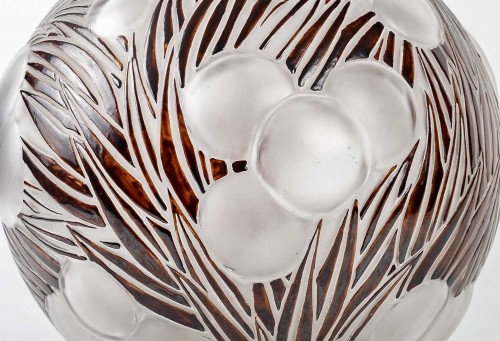 Vase "Oranges" en verre blanc émaillé brun d'origine à chaud créé par René Lalique en 1926 d'après un dessin de sa fille Suzanne.