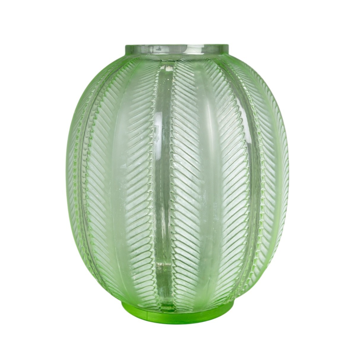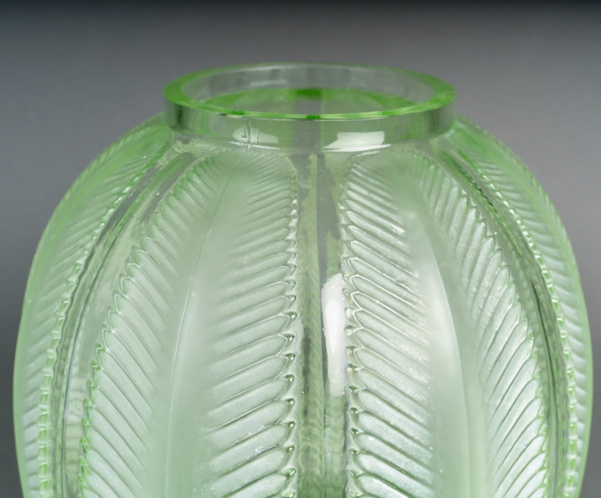 Vase "Biskra" en verre vert clair patiné blanc créé par René Lalique en 1932.