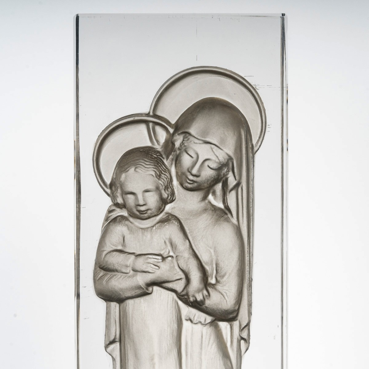 Statuette "Vierge à l'Enfant" en verre blanc patiné gris de René Lalique créé en 1934.