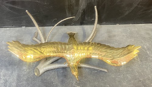 Table basse à l’aigle aux ailes déployées. Sculpture en laiton et branchage en fer, Bon état. Les dimensions sont sans le plateau