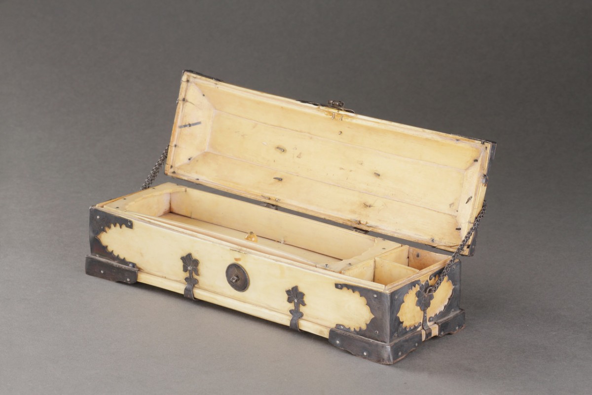 Une élégante boîte à écrire à montures en argent, incrustée d’ivoire, réalisée en Inde au XVII? siècle. Elle mesure 7 cm de haut, 26,5 cm de large et 9 cm de profondeur.