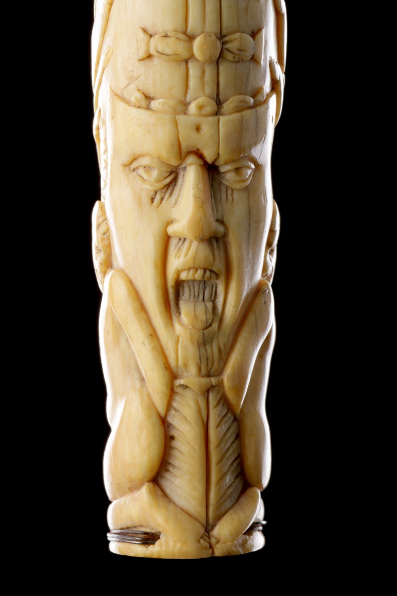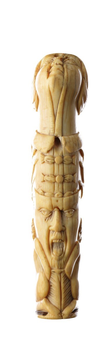 Manche d'épée ou de poignard finement sculpté avec une tête de femme, deux visages grimaçants flanqués de deux personnages nus agenouillés.