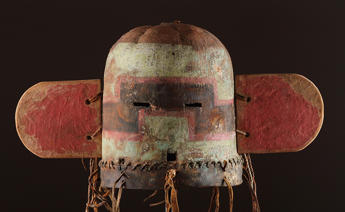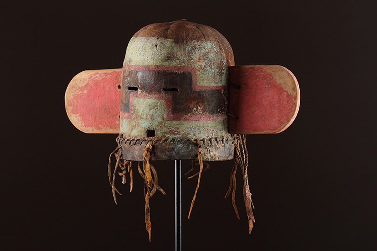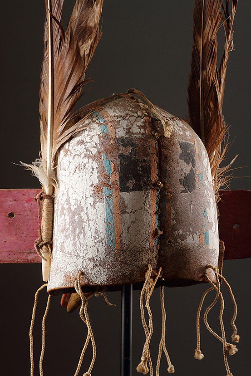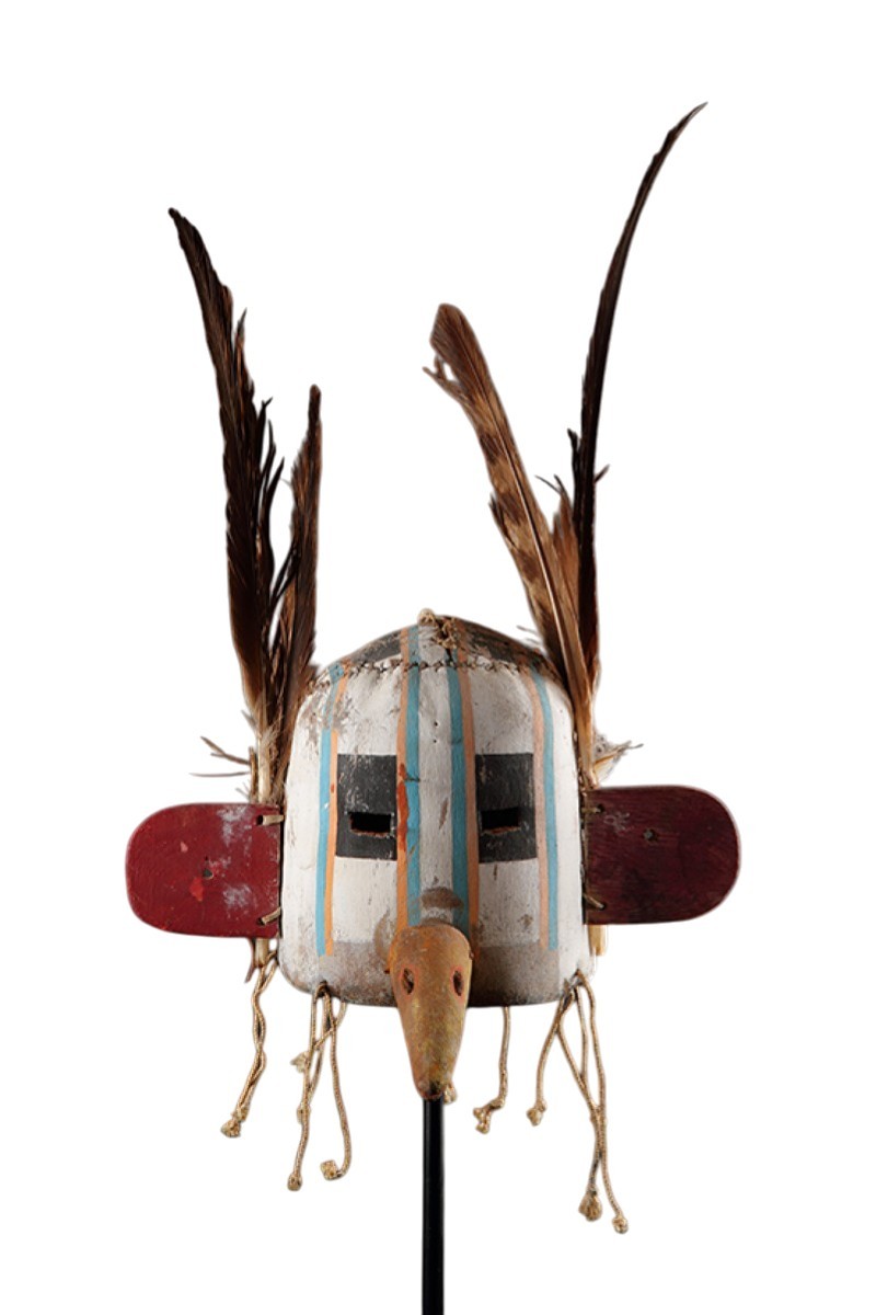 Un masque de danse Kachina Hopi en forme de casque, en cuir peint et pigmenté, avec un grand bec d’oiseau sculpté en bois de peuplier (cottonwood) en saillie et deux oreillettes, attaches en tendon et en corde, l’ensemble orné de plumes d’aigle