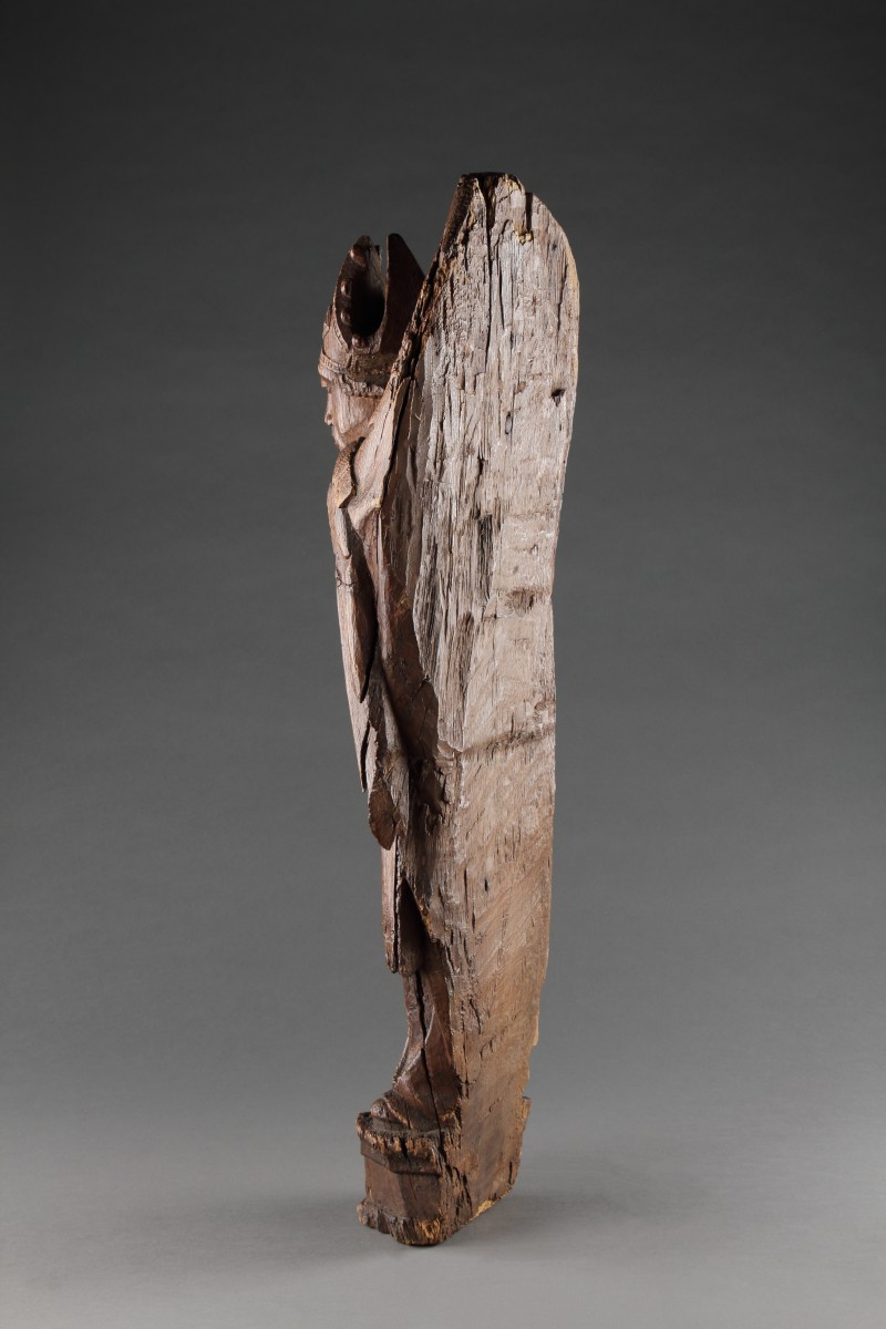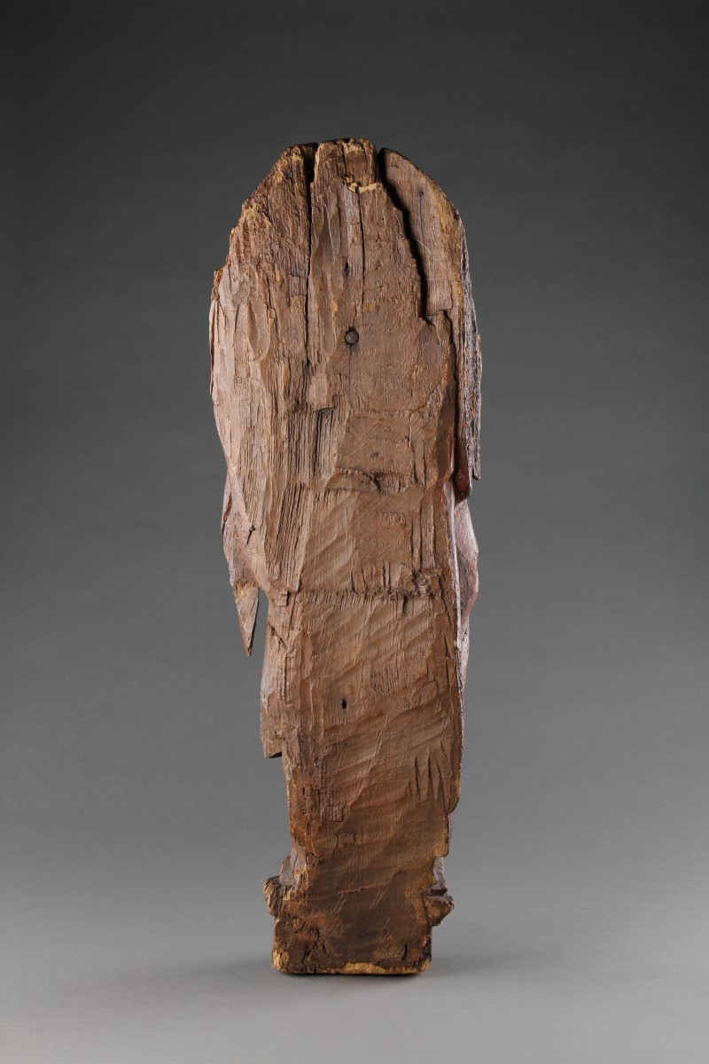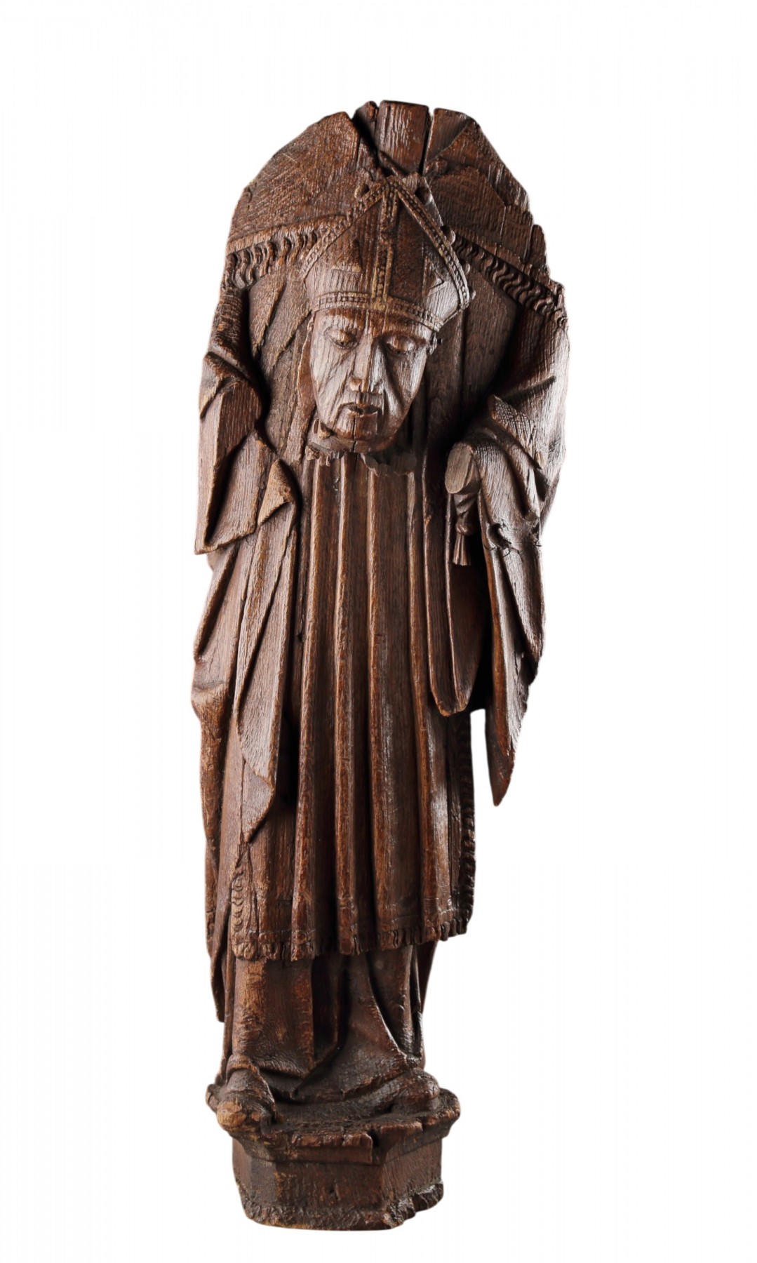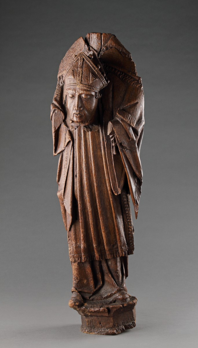 Une rare sculpture de saint Denis sculpté en haut-relief, l’évêque décapité tenant sa tête contre sa poitrine, dressé sur un piédestal incliné