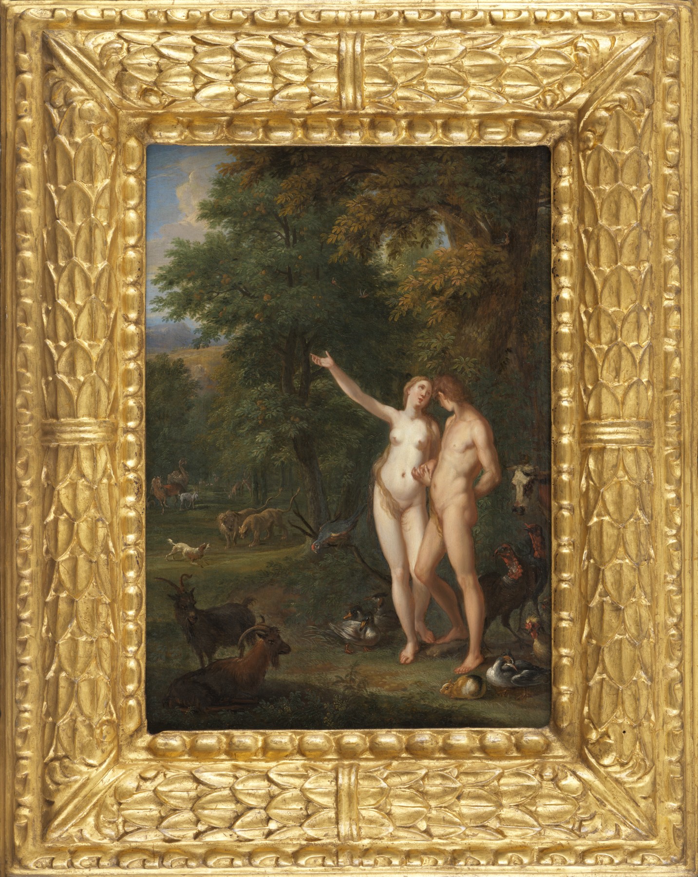 Au cœur d’une nature généreuse peuplée d’animaux, Adam et Ève se tiennent devant l’arbre de la connaissance empli de fruits. Leurs corps nus ne sont pas exposés avec provocation, mais sont rendus avec une douceur qui évoque l’innocence originelle. Ce qui frappe, c’est la grâce de leurs silhouettes élancées, héritage d’un maniérisme élégant, et surtout le geste de tendresse qui les unit : les doigts entrelacés sont l’assurance que rien ne saura les séparer. L’instant saisit n’est pas seulement le moment de tentation qui précède la chute, mais un instant de complicité silencieuse qui mêle deux êtres dans l’harmonie du monde. Ainsi, la narration biblique devient une scène d’intimité humaine.