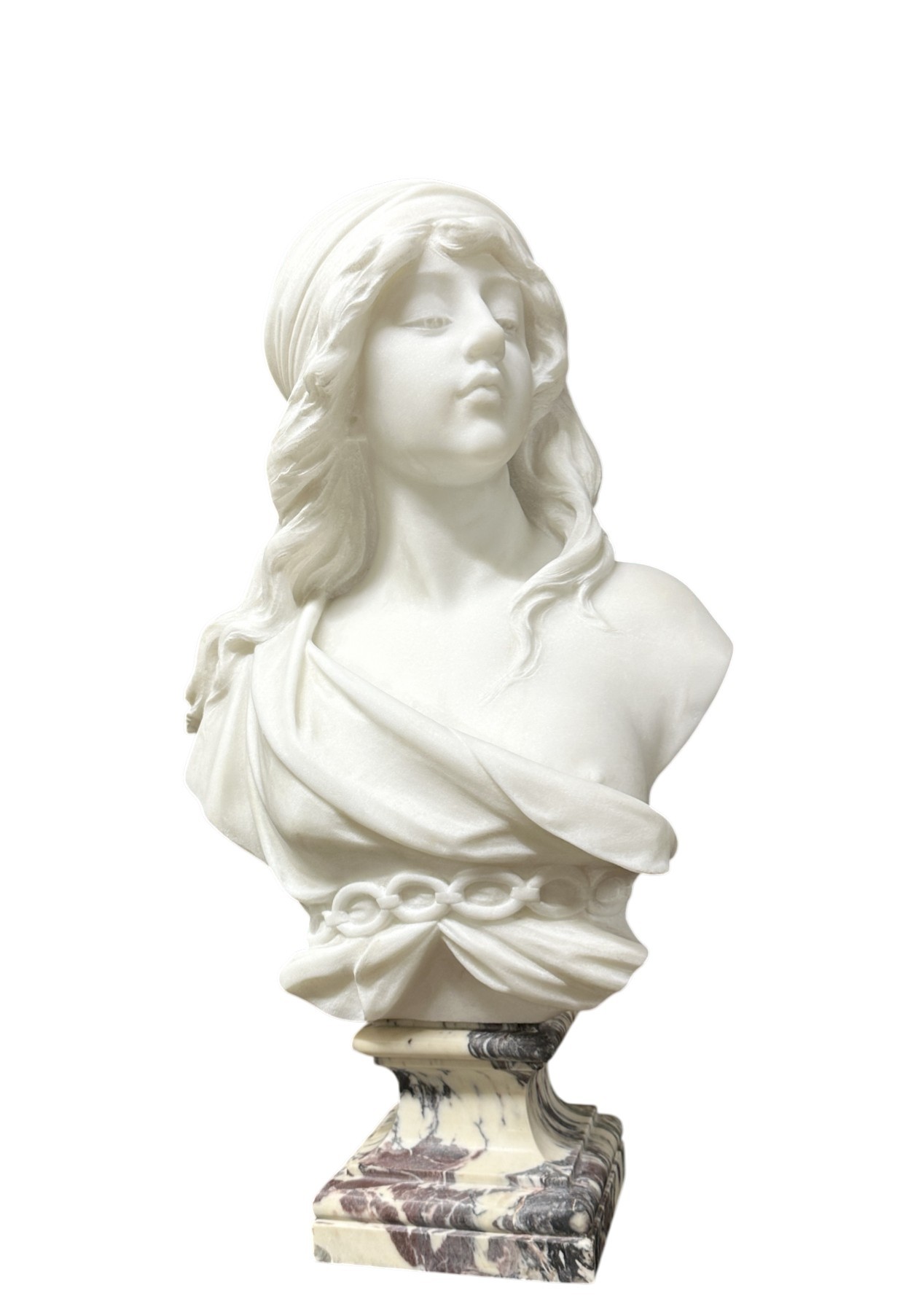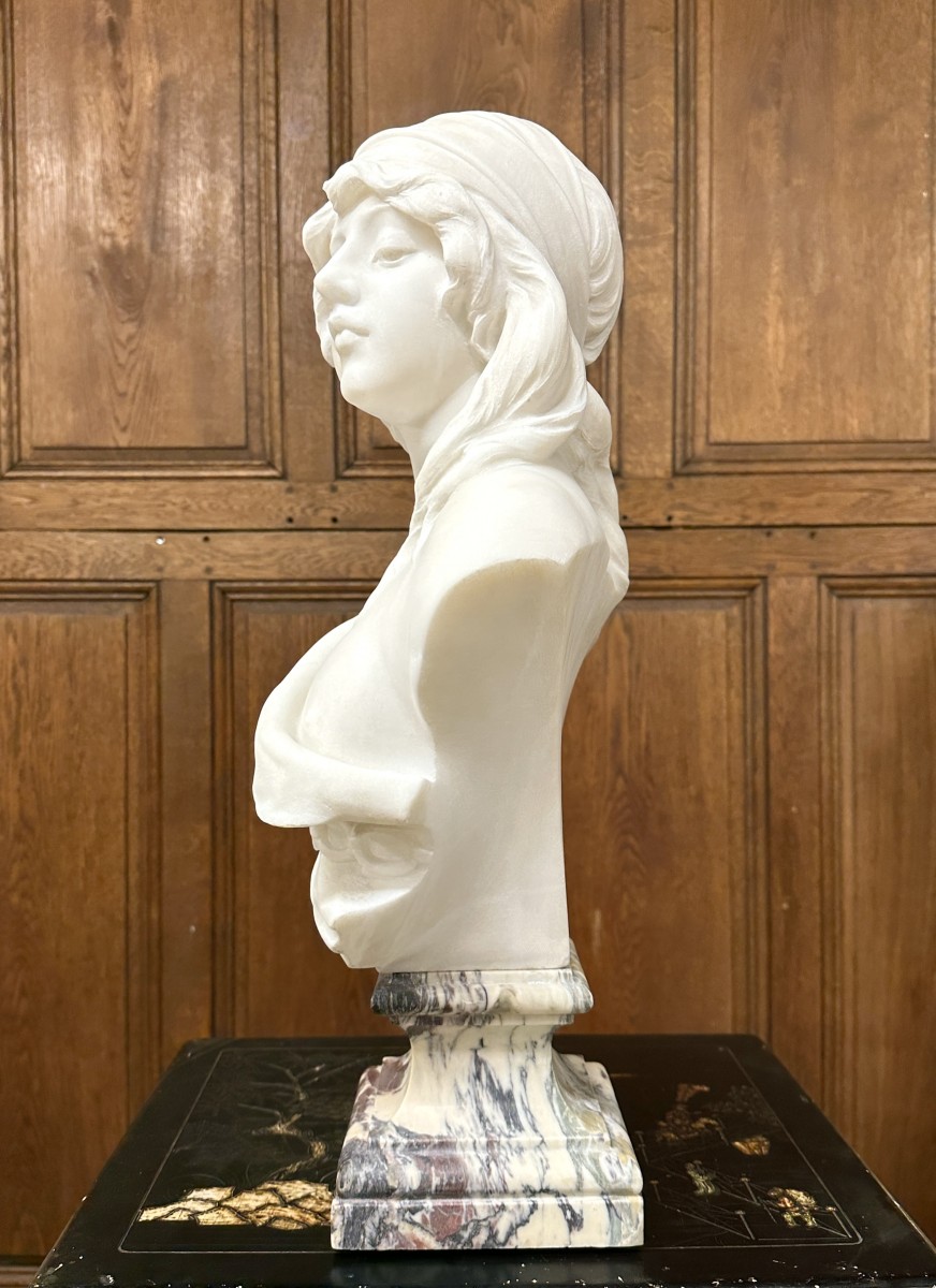 Buste de jeune fille en marbre blanc de Carrare finement sculpté reposant sur une base en marbre veiné violet. Travail vers 1900 d'époque Art Nouveau de très belle finesse. Parfait état. Signature au dos "Cipriani".