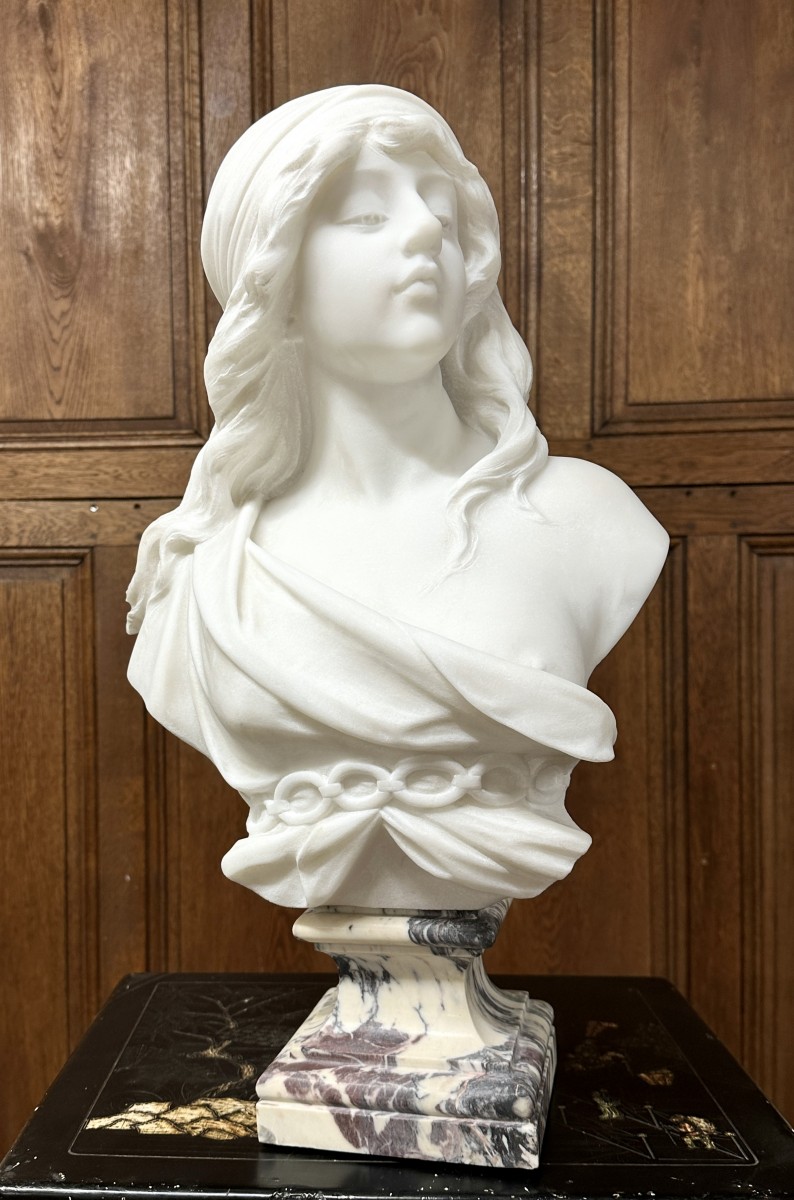Retrouver le mobilier ou les objets d''art similaires à « Adolfo Cipriani (1880-1930) - Buste de jeune femme en marbre blanc de Carrare » présenté par Marius Simon Antiquités, antiquaire à Saint-Ouen dans la catégorie Sculpture en Marbre Art nouveau, Sculpture.