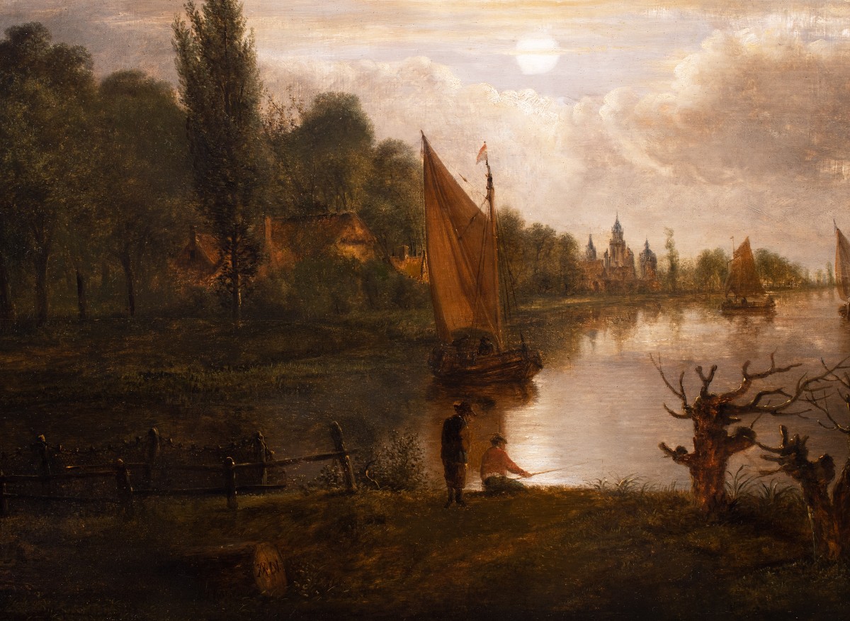 Cette œuvre remarquable, attribuée au maître hollandais du Siècle d’or Aert van der Neer, représente une scène nocturne empreinte de poésie : une vue de Boom sur le Rupel, baignée par la lumière douce et argentée de la lune. Deux pêcheurs occupent le premier plan, ajoutant une touche humaine à ce paysage silencieux et contemplatif.