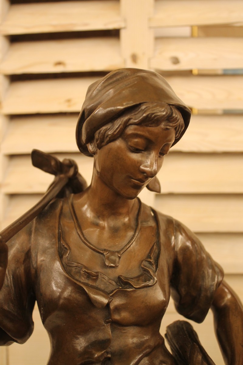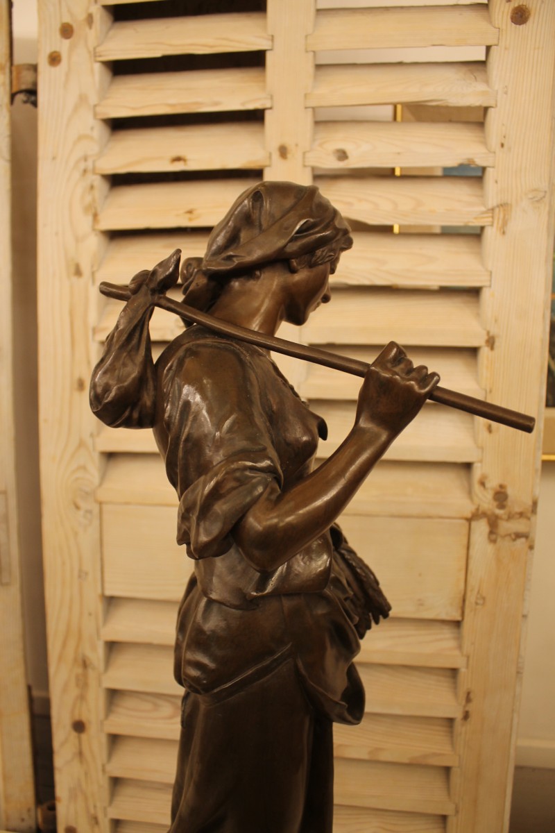 Grande sculpture en bronze à patine brune d'origine représentant une Glaneuse, elle est signée AIZELIN sur la base et porte sur le socle une cartouche gravée GLANEUSE par E.AIZELIN (HC) OFFICIER DE LA LEGION D'HONNEUR.