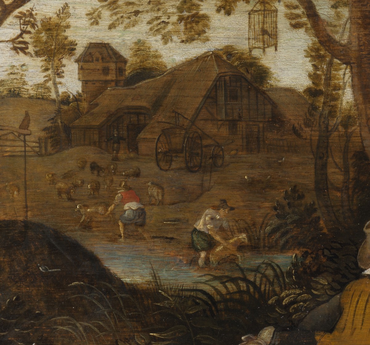 Au premier plan, une femme en robe rouge et tablier blanc pèse des cerises, tandis qu’un garçon attend qu’elle remplisse son chapeau des délicieux fruits. Dans la peinture classique, la cerise est une évocation de l’été et de sa brièveté. Au second plan, séparé du premier par un ruisseau, des bergers capturent des moutons en vue de les tondre. La tonte est une activité agreste pratiquée durant la saison estivale. Enfin, en arrière-plan, une grange, un grenier et un clocher ponctuent l’horizon d’une nature vallonnée. Ainsi, fruits rouges et moutons tondus évoquent-ils la belle saison.