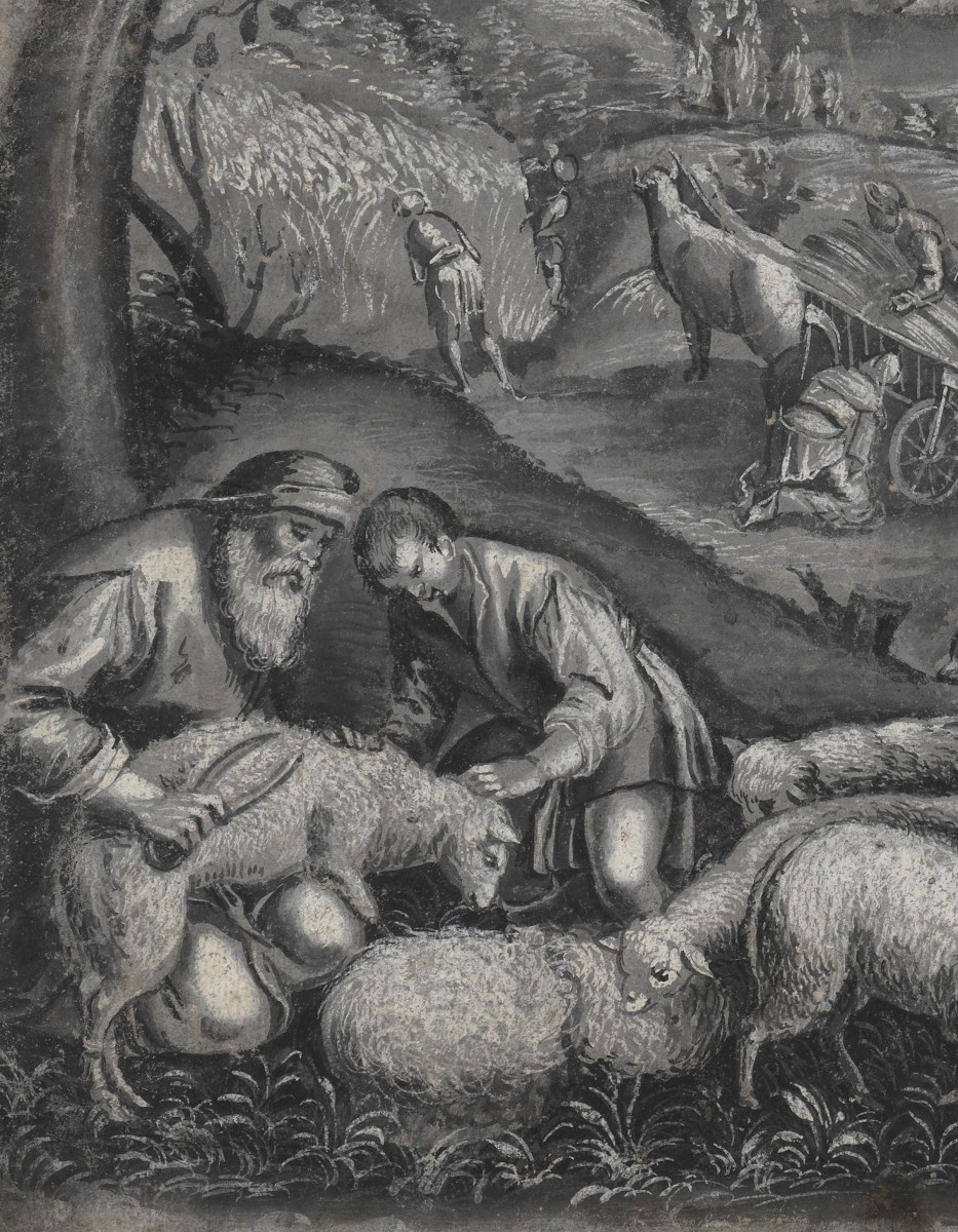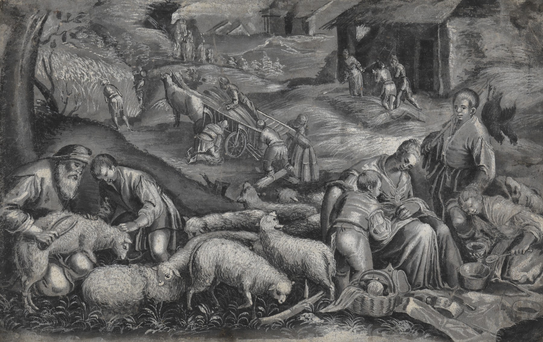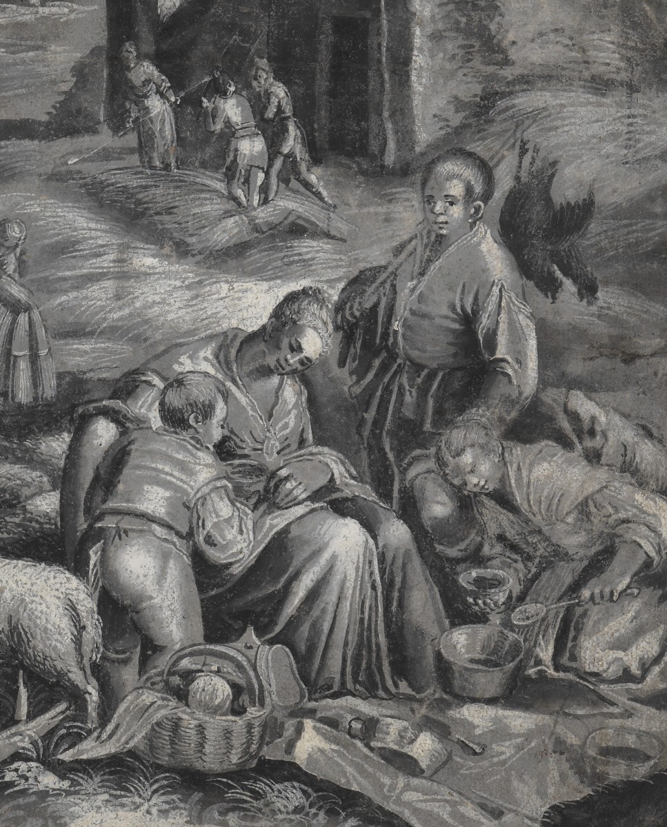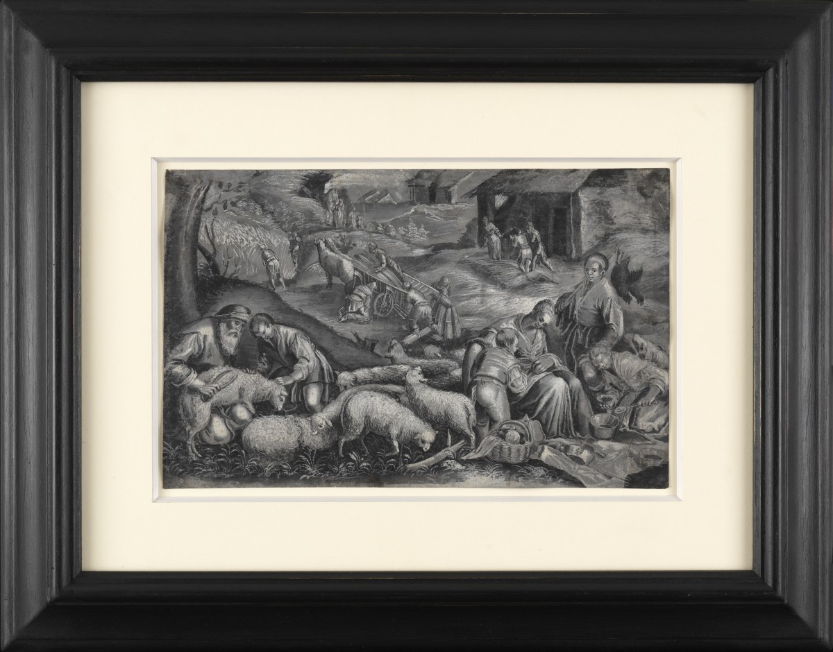 Notre composition est une représentation allégorique de l’été largement empruntée au coloriste vénitien du XVIe siècle Jacopo Bassano. Bien au-delà de l’interprétation d’une œuvre mainte fois pastichée par les peintres européens des siècles suivants, notre dessin n’en est pas moins original : le choix du media (crayon noir et gouache) dans une version monochrome plutôt que de tenter une restitution de la palette de Bassano en fait une pièce de collection unique.