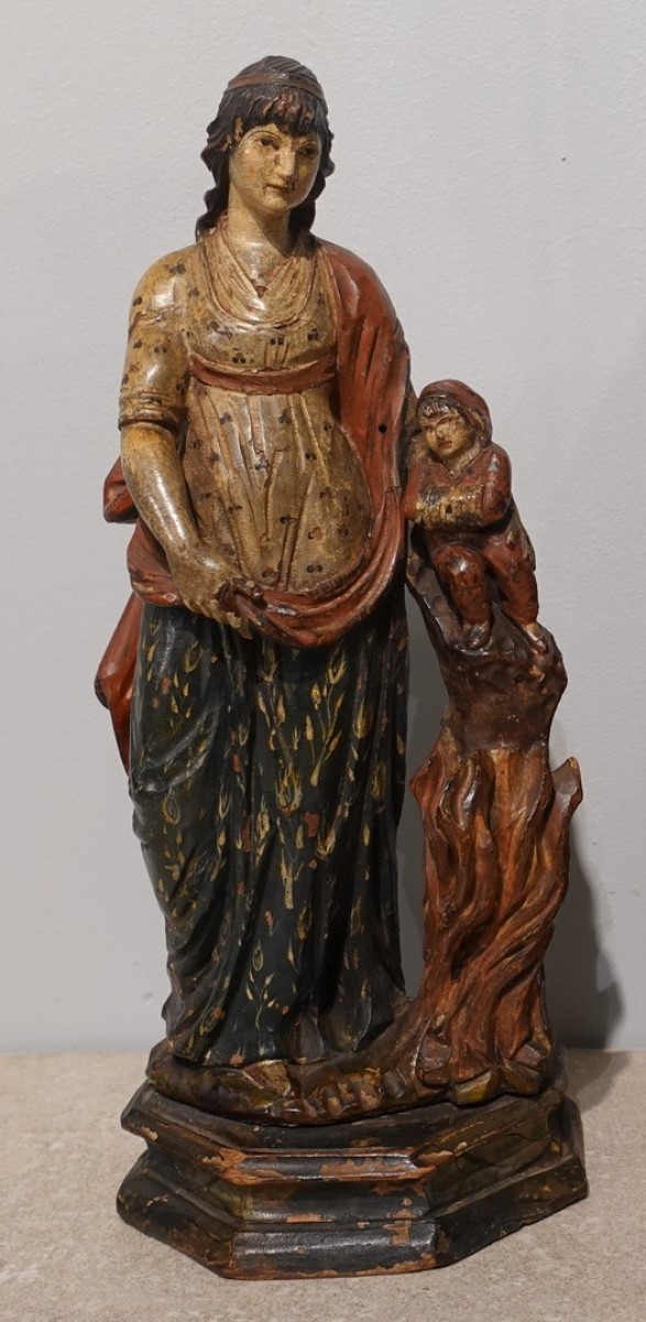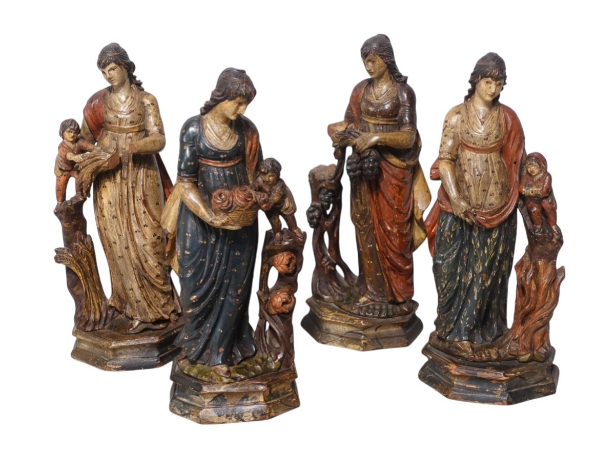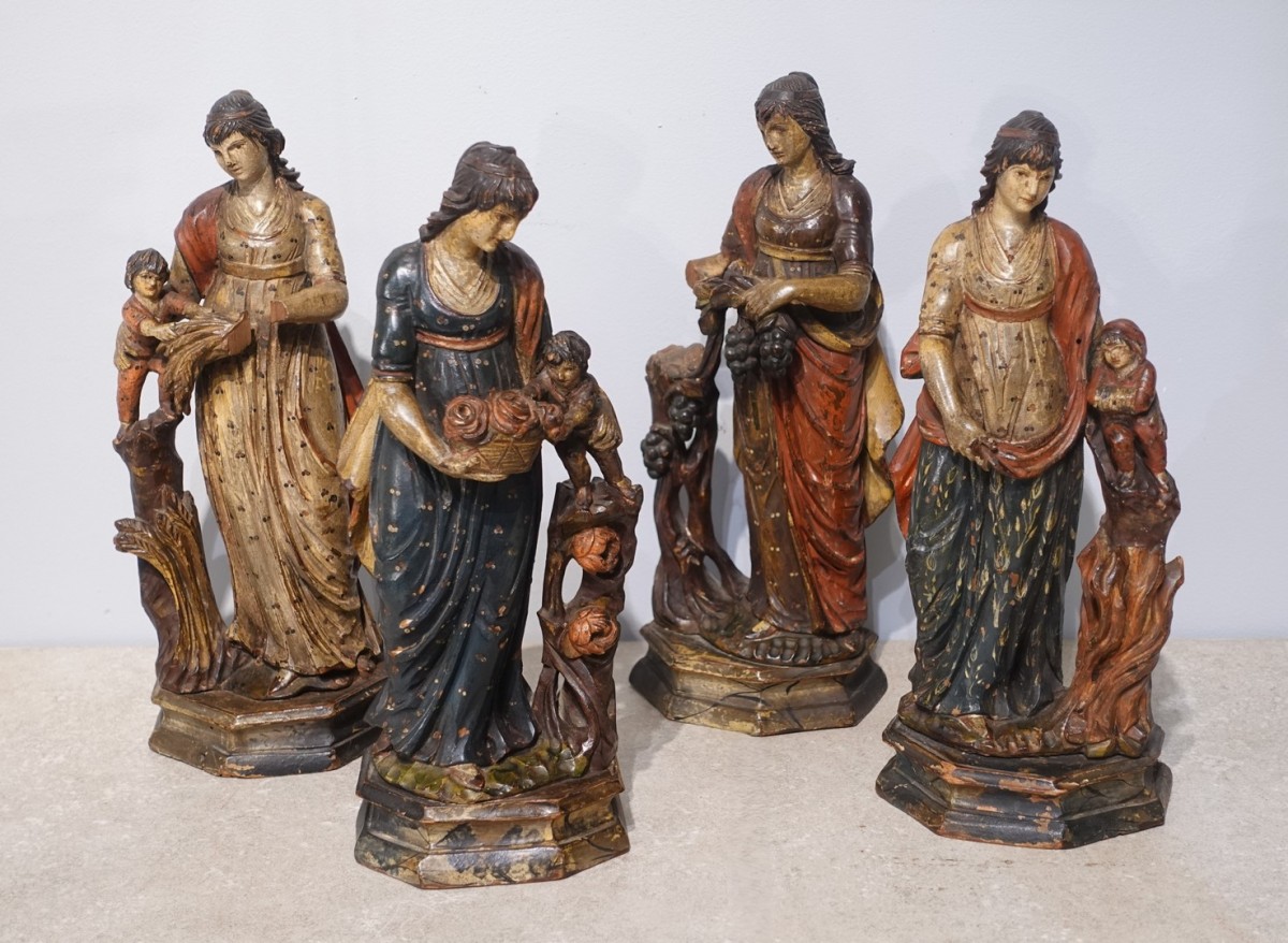Nos quatre figures sculptées sur tilleul polychrome représentent l'allégorie des quatre saisons.