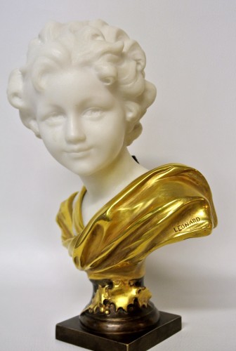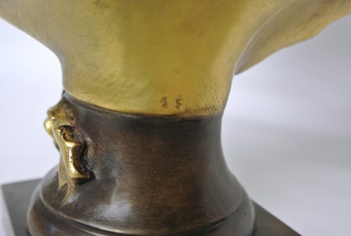 Buste en marbre (Carrare) et bronze à double patine or et brune. Edité au début du XXe siècle (vers 1920) dans un très bel état de présentation selon son ancienneté (légères traces dans le marbre), signature et numérotation sur la partie bronze. Un modèle similaire titré «Amour Cruel» est présenté p.211 dans l’ouvrage de référence : Art-Déco de Bryan Catley.