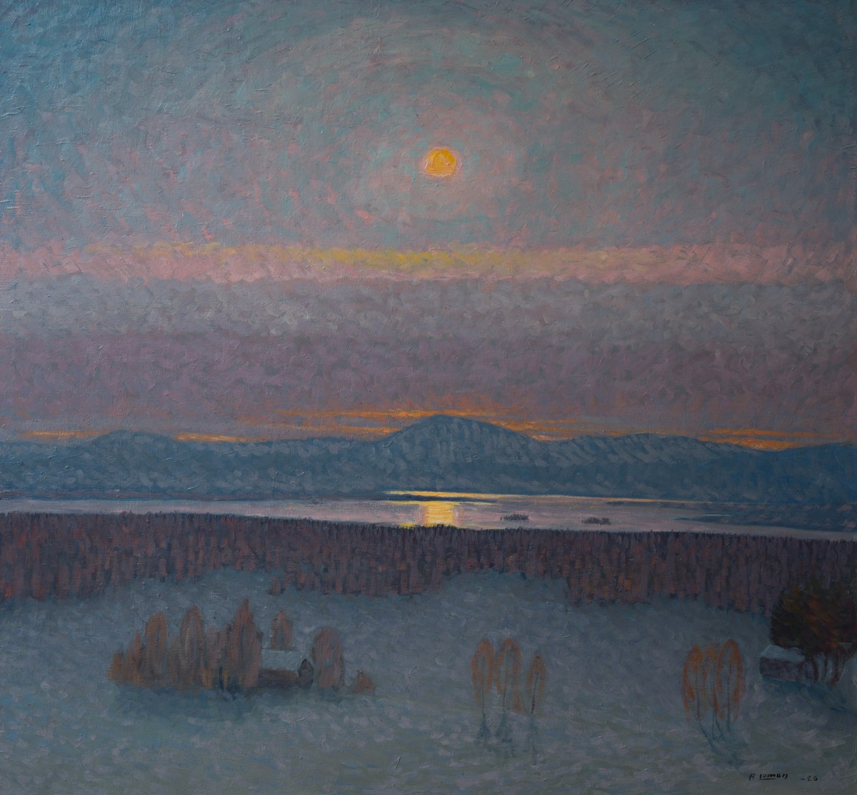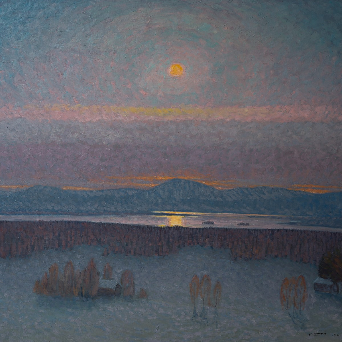 La présente peinture, datée de 1926, appartient à une phase de maturité dans la carrière de Loman, lorsque son langage pictural avait atteint un degré notable de raffinement. La composition s’organise en bandes horizontales de couleur et de tonalité, créant une profondeur spatiale tout en maintenant une unité d’ensemble. Le traitement de la lumière est atténué et indirect, contribuant à une atmosphère contemplative plutôt qu’à la description d’un lieu précis. De telles œuvres témoignent de la capacité de Loman à distiller le paysage en relations essentielles de couleur et de forme.