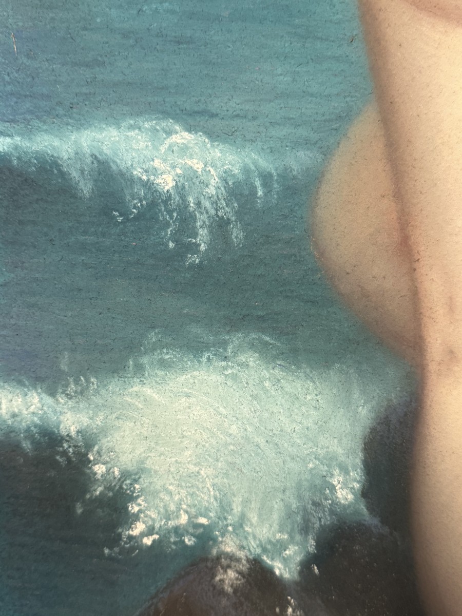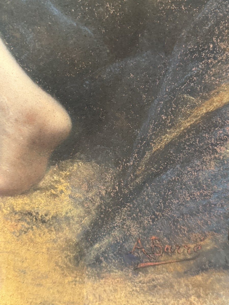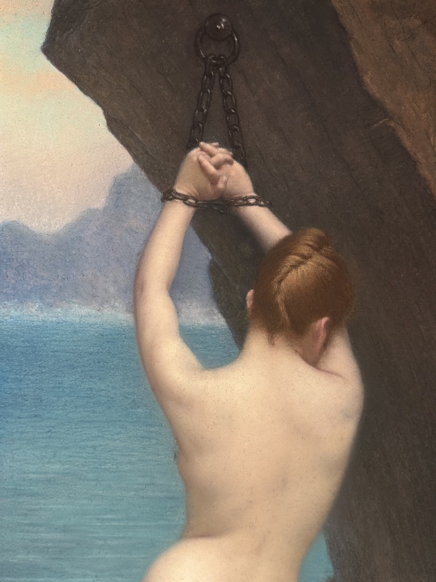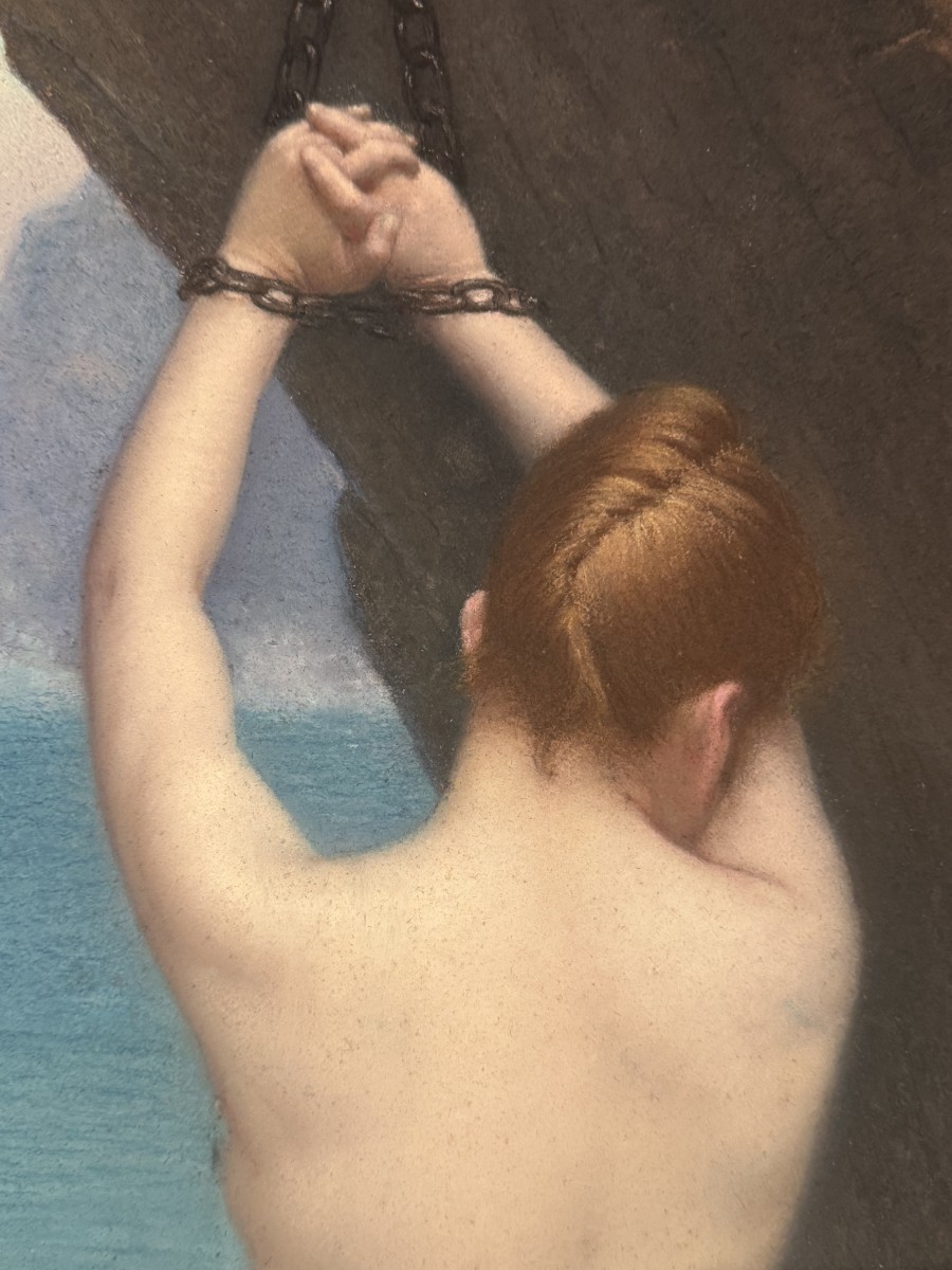 Grand pastel représentant Andromède enchainée au rocher, attendant sa délivrance par Persée. Princesse Ethiopienne, fille du roi Céphée , elle est victime de l'orgueil de sa mère Cassiopée. Exposée sur un rocher pour y être dévorée par un monstre marin, elle est sauvée de justesse par Persée dont elle deviendra l'épouse. Signé en bas à droite A.BARRÈ, sans doute le peintre de figures qui exposa à la Royal Academy de Londres en 1875. cf. Bénézit T.1, p.461 Cadre art nouveau en cours de restauration. 95 x 37 à vue.
