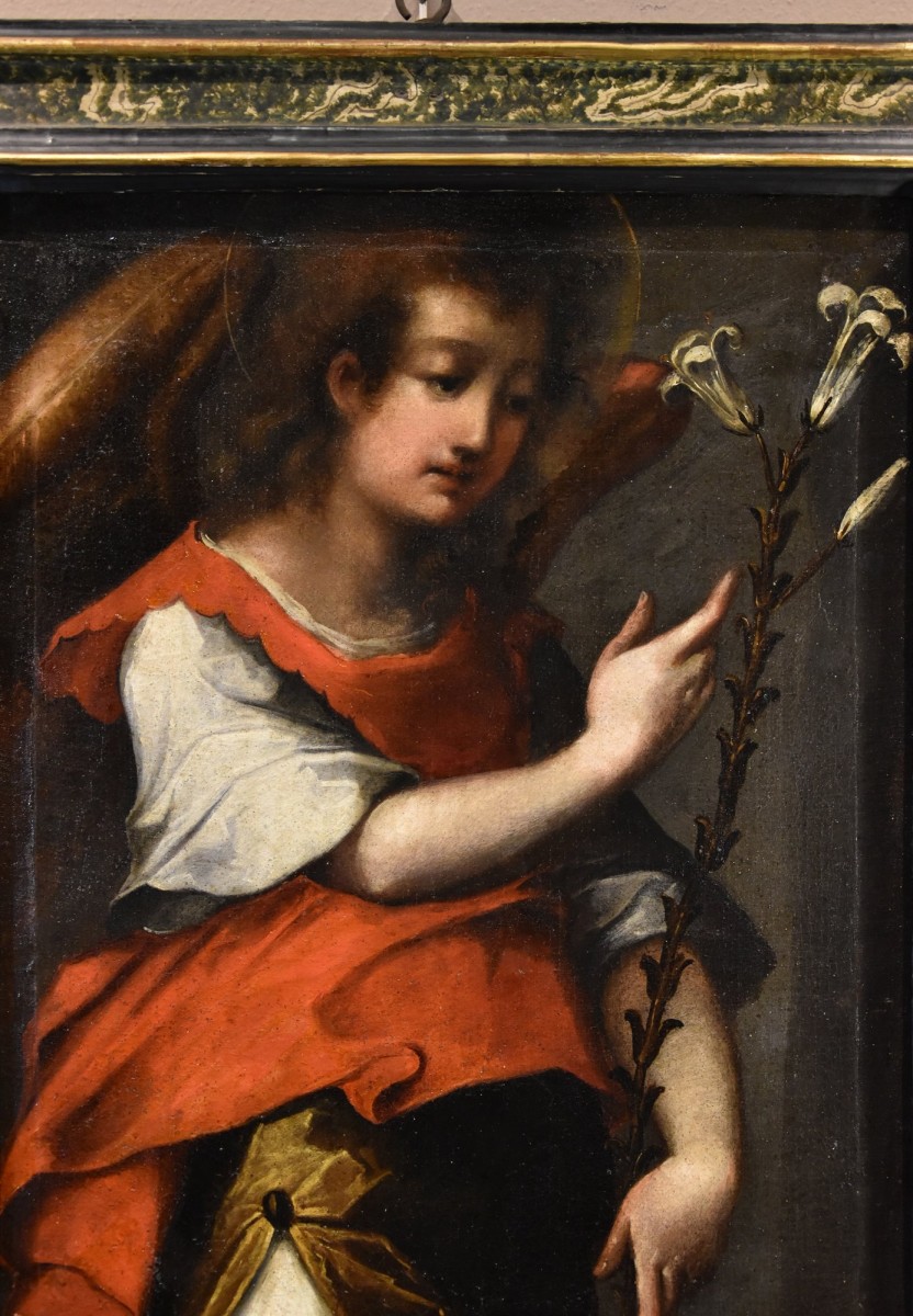 Retrouver le mobilier ou les objets d''art similaires à « Ange de l'Annonciation, Peintre toscan du XVIIe siècle » présenté par Antichità Castelbarco, antiquaire à Riva del Garda dans la catégorie Tableaux XVIIe siècle Louis XIII, Tableaux et dessins.