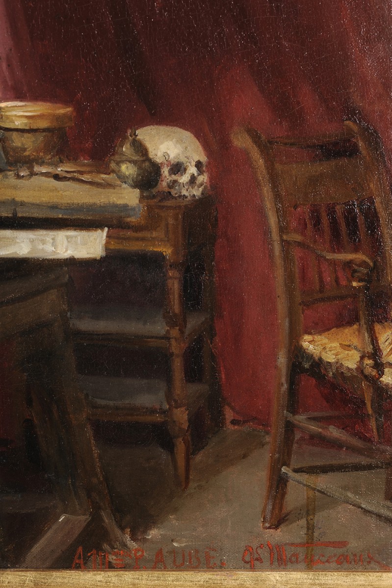 Le jeune Manceaux, qui avait passé sa jeunesse en Corse avant de rejoindre les Beaux-Arts de Paris, présenta la même année ce portrait de Jean-Paul Aubé, sobrement désigné comme « un coin de l’atelier d’un sculpteur ». C’était sa première participation au Salon, dont le catalogue le désigne comme « élève de Cabanel et Aubé ». Jean-Paul Aubé a-t-il vraiment été son professeur, ou plutôt son premier protecteur parisien ? On sait qu’il avait choisi Manceaux comme modèle de son Joubert excitant ses troupes, monument destiné à Bourg-en-Bresse. Par la suite, Manceaux se perfectionnera avec Jules-Elie Delaunay et Gustave Moreau, avant d’aller exercer à Beauvais où il sera pendant plus de trente ans professeur de dessin et collaborateur de la Manufacture de tapisseries.