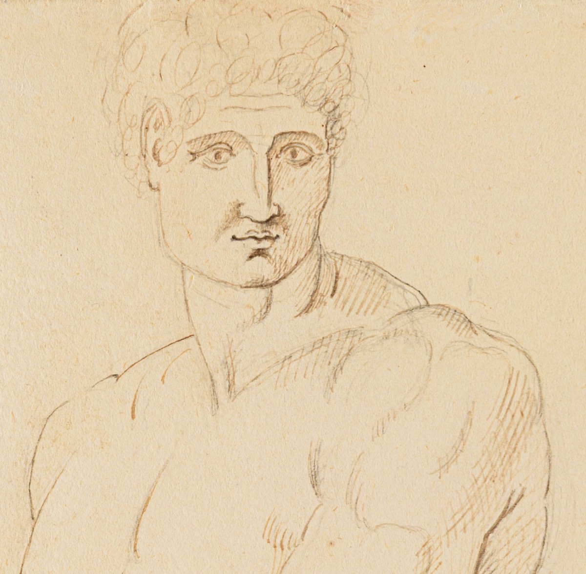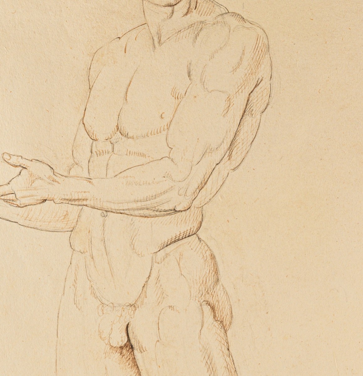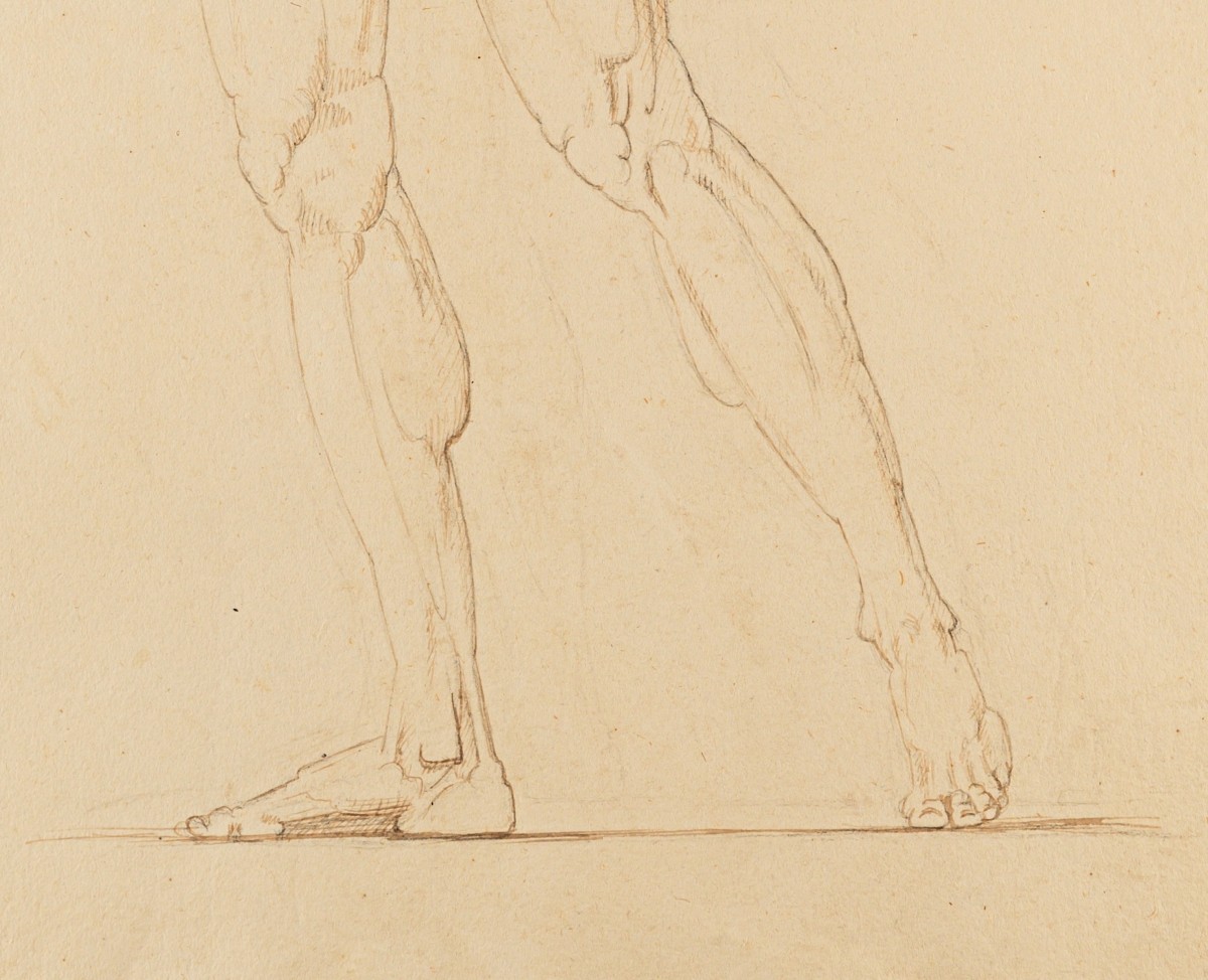 Le dessin que nous présentons, exécuté à la plume, encre et crayon, illustre parfaitement l’importance du travail graphique dans sa pratique. Canova y étudie un nu masculin debout, légèrement déhanché, dont la posture retenue suggère une tension interne maîtrisée.
