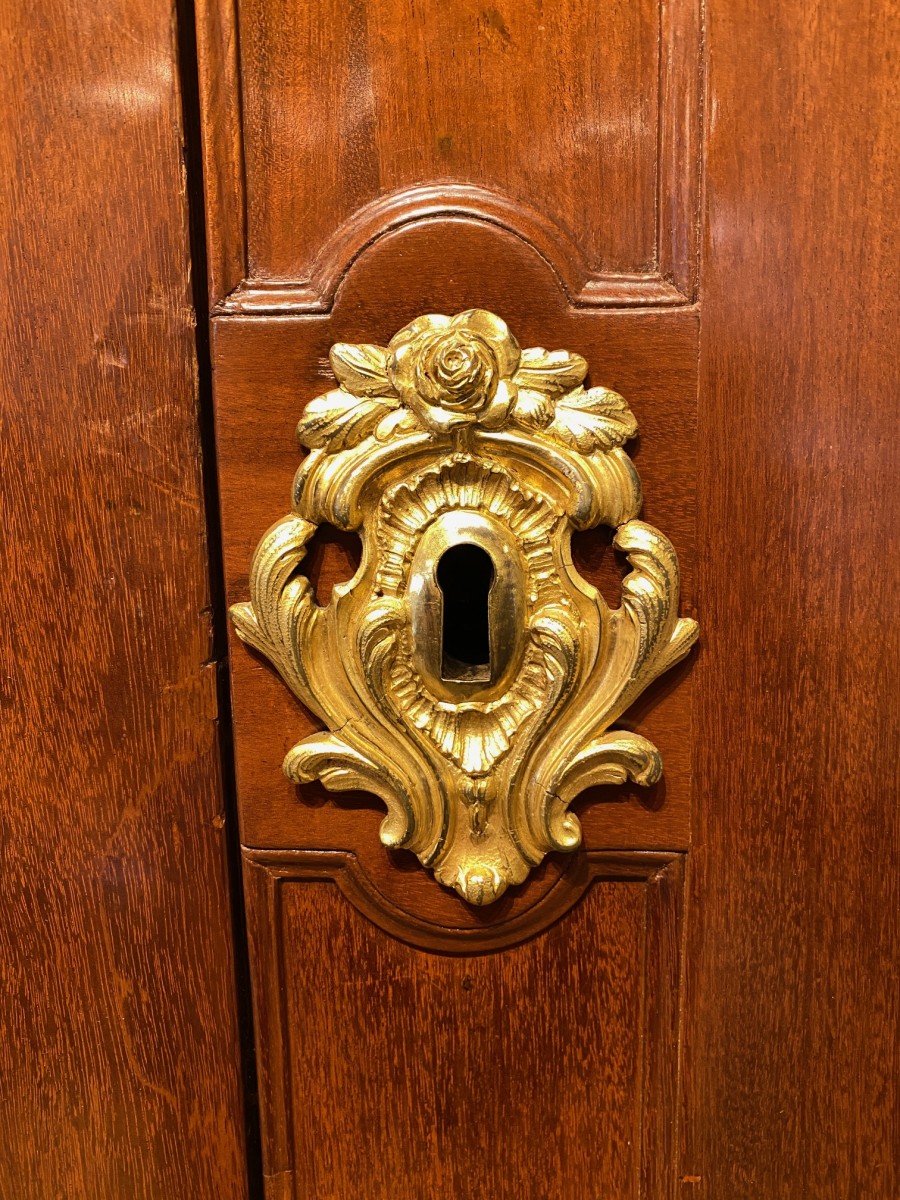 Ce contraste est visible sur notre armoire au niveau des bronzes qui présentent un décor franchement Louis XV, même si la rose de l’entrée de serrure et la symétrie de l’ensemble nous indiquent le début d’une nouvelle ère.