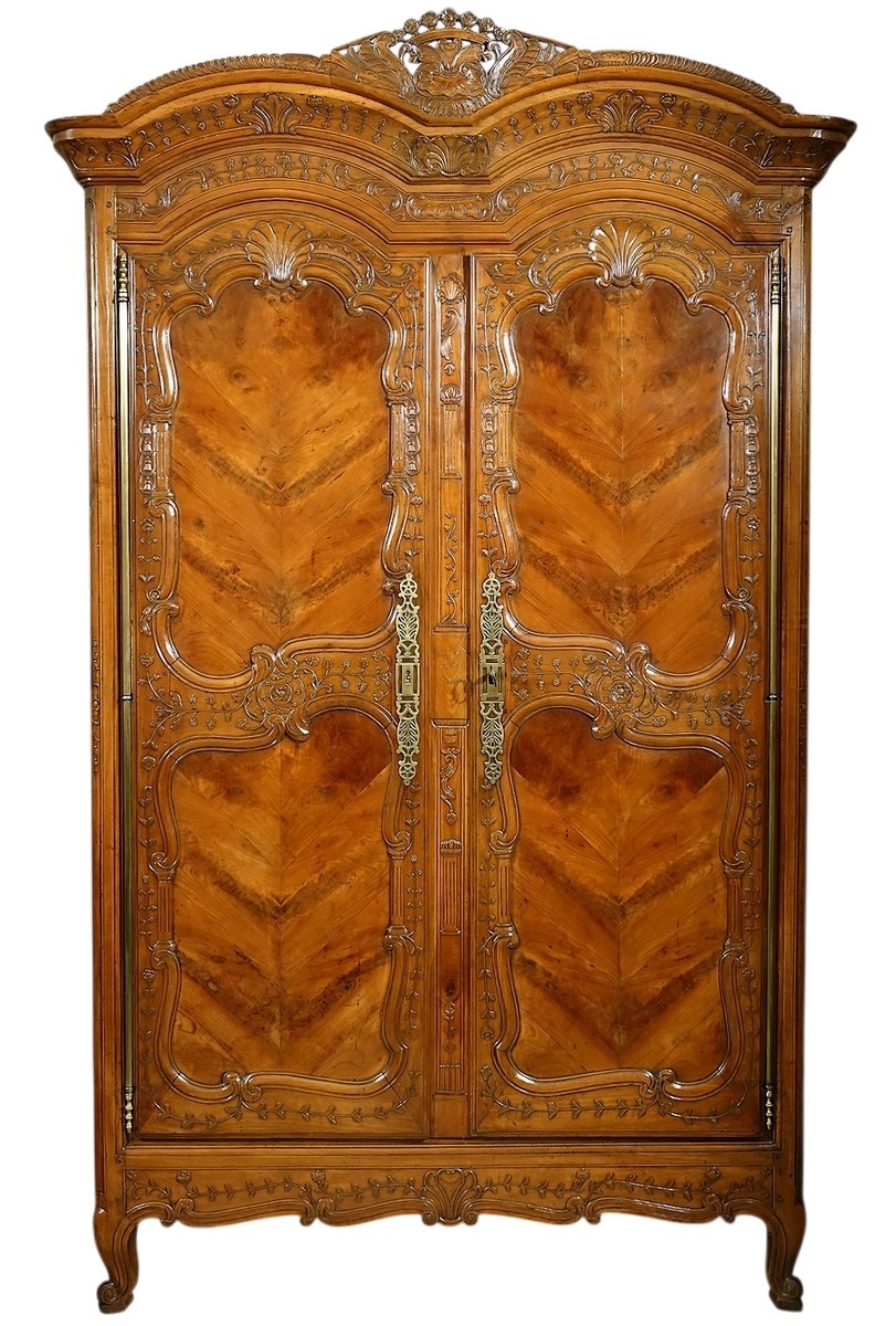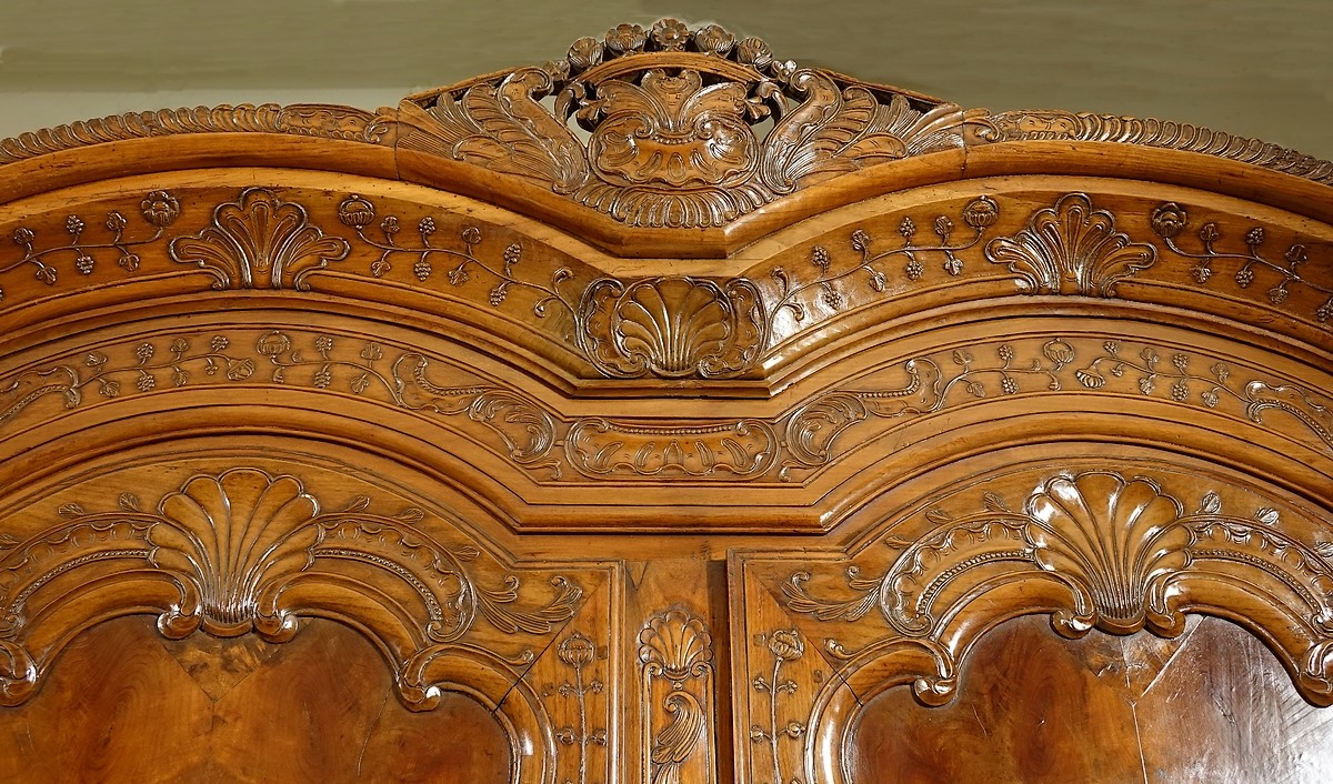 Quoiqu'il en soit, tout comme notre autre armoire datée 1836 vendue tout récemment, elle est sculptée d'éléments décoratifs de l'atelier parfaitement reconnaissables, en particulier les colonnes ioniques aux moulures des panneaux supérieurs, un cœur au centre de la traverse basse qui est à considérer comme une véritable signature figurative des Croizé, des galbes de pied parfaits (que ne réussissent jamais aussi bien les autres menuisiers du pays de Rennes), un fronton de corniche particulièrement bien travaillé et enfin une grande finesse de sculpture associée à une parfaite grâce des courbes sans le moindre heurt ou rigidité.