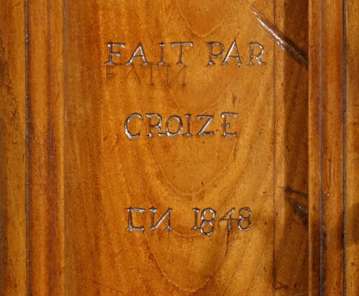 Cette armoire est donc une fabrication de l'atelier Croizé dont elle porte la signature, sans qu'il soit possible d'en déterminer l'auteur avec certitude, même s'il nous semble y voir "le ciseau" de Charles II Croizé lui-même, alors que 1848 est l'année où il va s'éteindre.