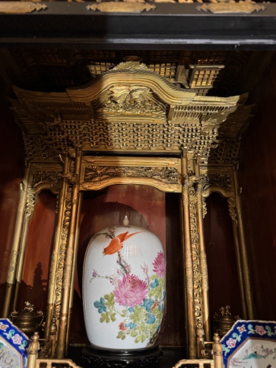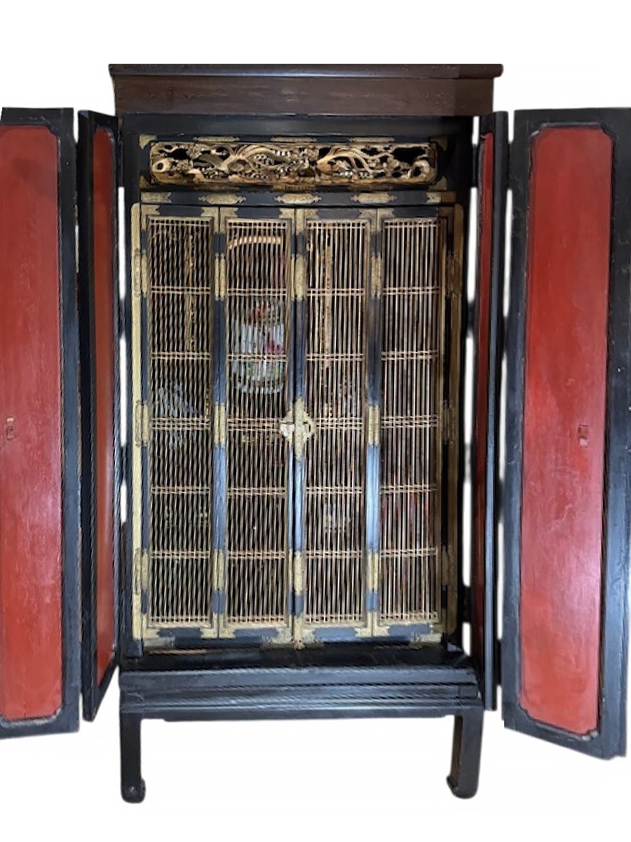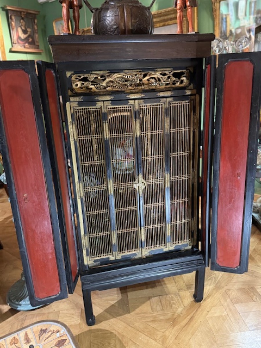 Armoire de sanctuaire Japonais XIXe en bois exotique qui est posée sur une table laqué ,l'armoire comprend un autel en bois doré richement ornementé de décor finement sculpté,les 2 premieres portes cache deux autres portes trés finement sculpté qui protége un magnifique autel .