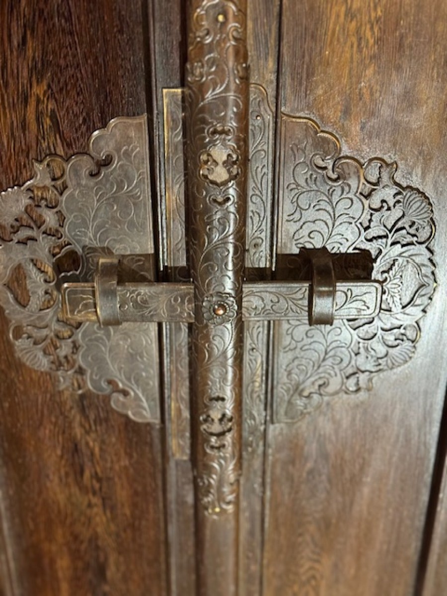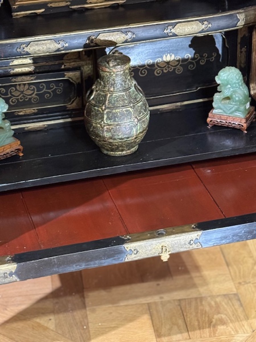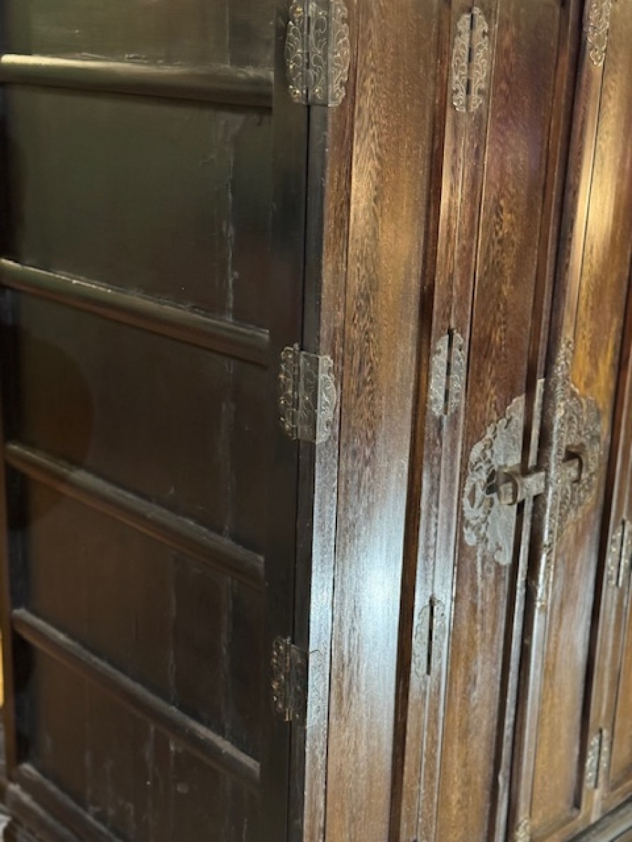 Armoire de sanctuaire Japonais XIXe en bois exotique qui est posée sur une table laqué ,l'armoire comprend un autel en bois doré richement ornementé de décor finement sculpté,les 2 premieres portes cache deux autres portes trés finement sculpté qui protége un magnifique autel .