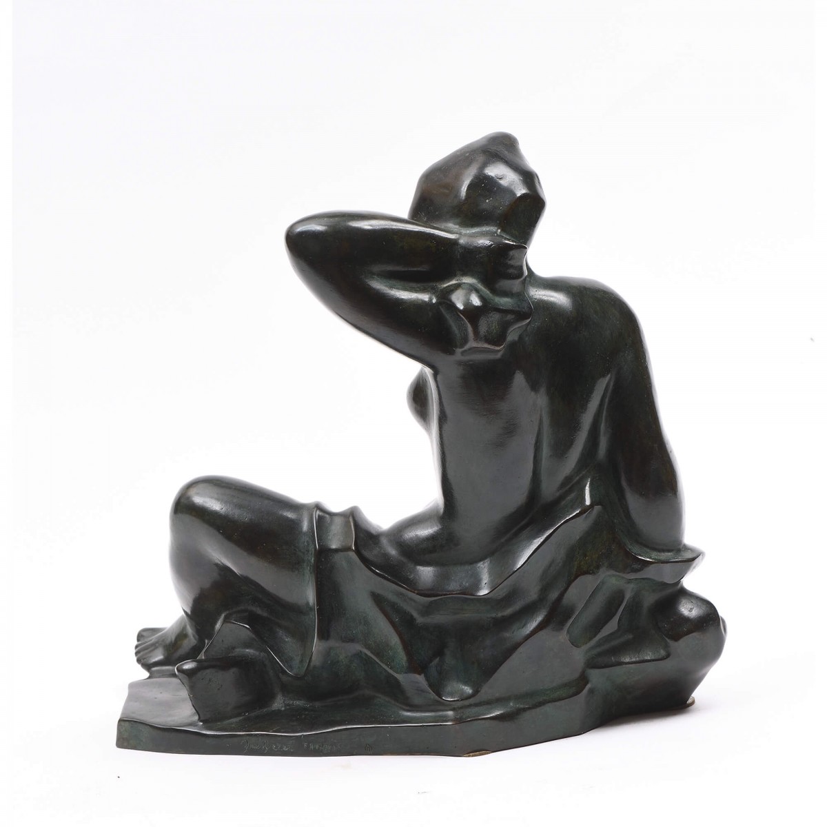 Cette sculpture en bronze représente un nu féminin assis, dans une posture à la fois détendue et structurée. Le bras relevé derrière la tête introduit un mouvement diagonal qui équilibre la stabilité de la jambe repliée.