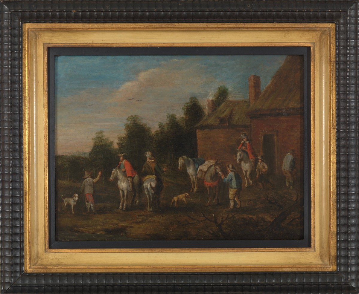 Comme le faisait souvent le peintre néerlandais Philips Wouwerman, cet artiste a représenté des voyageurs faisant halte dans une auberge ou une ferme. L’un des hommes est descendu de son cheval pour uriner contre la façade du bâtiment. Le motif de l’homme en train d’uriner était loin d’être une exception dans la peinture de genre néerlandaise de l’époque.