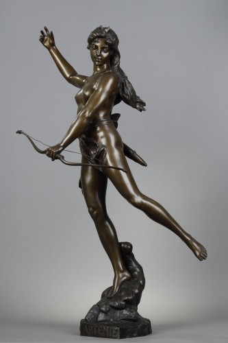 Grande sculpture en bronze de la fin du XIXe siècle représentant la déesse Artémis, armée de son arc, réalisée par l'artiste français Eugène Marioton (Paris, 1857 - Paris, 1933). Cette œuvre porte la marque du fondeur, "Usines Vojave Société Anonyme Bruxelles".