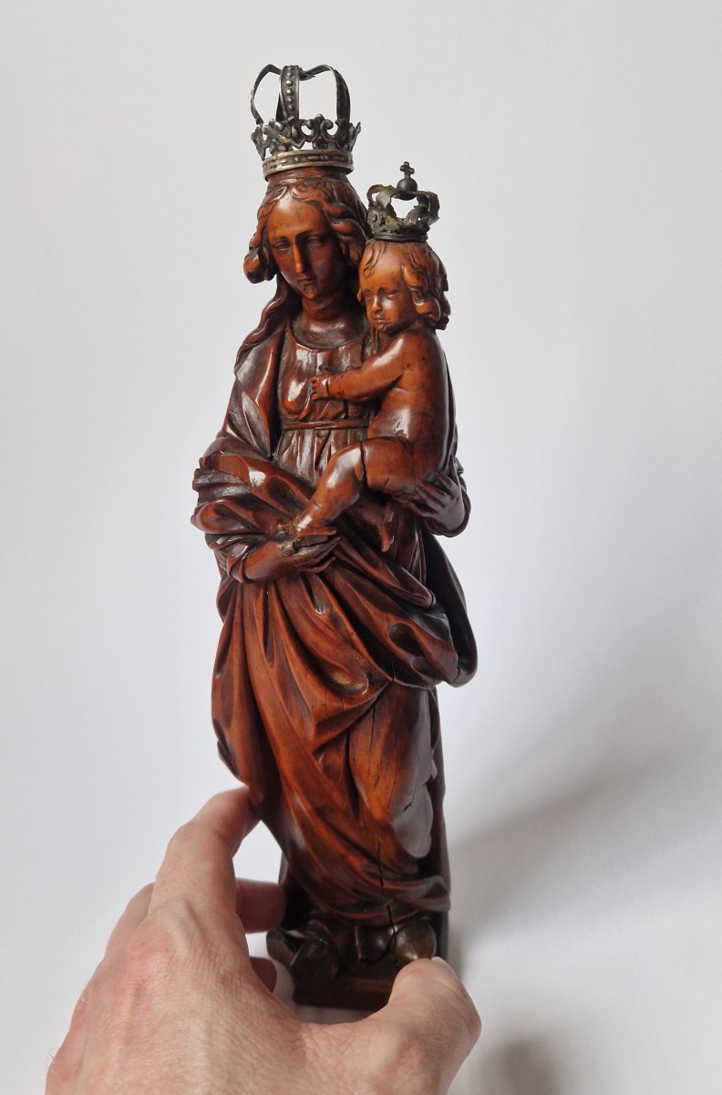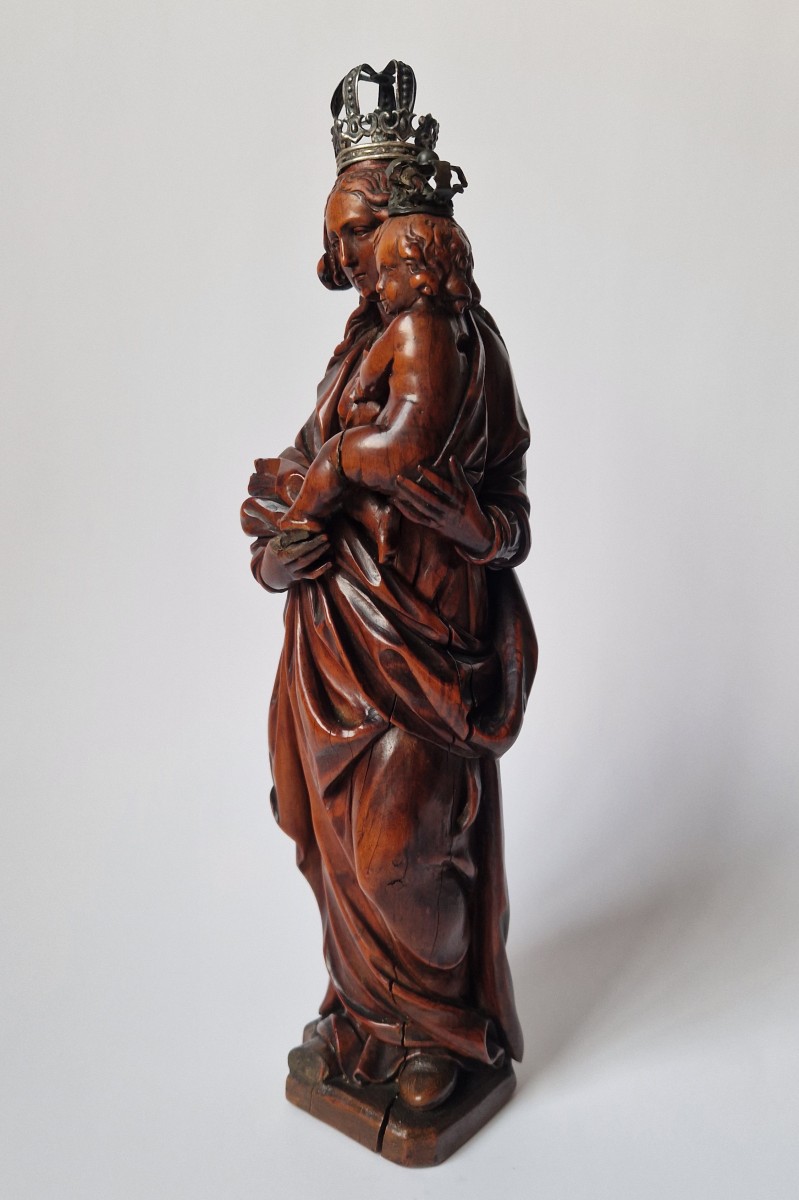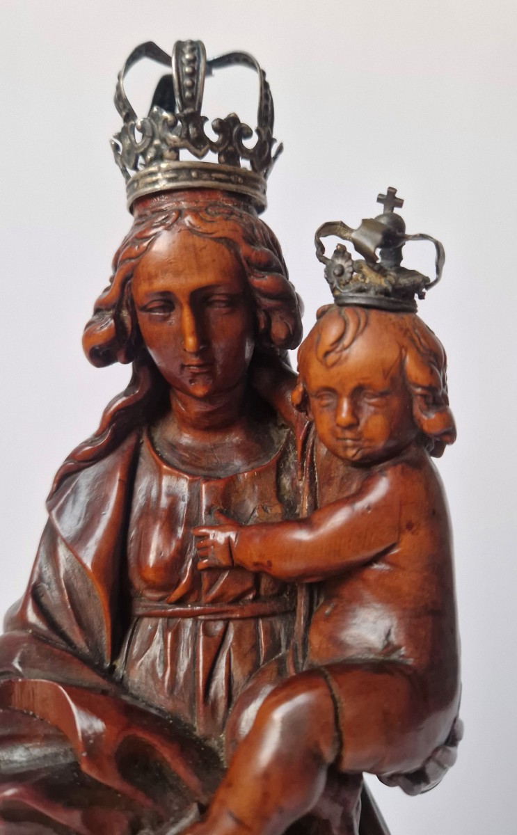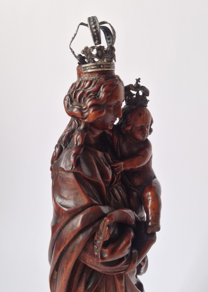 Magnifique sculpture en buis représentant la Vierge à l'Enfant, probablement réalisée à Malines ou ailleurs en Flandre vers 1600-1650 et destinée à la dévotion privée. La conservation des couronnes en métal est exceptionnelle.