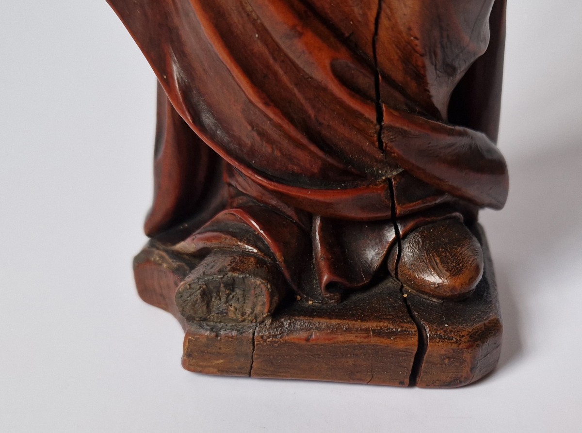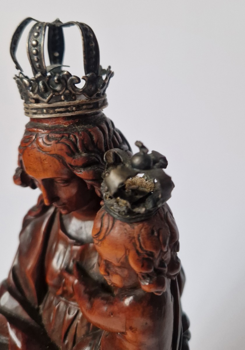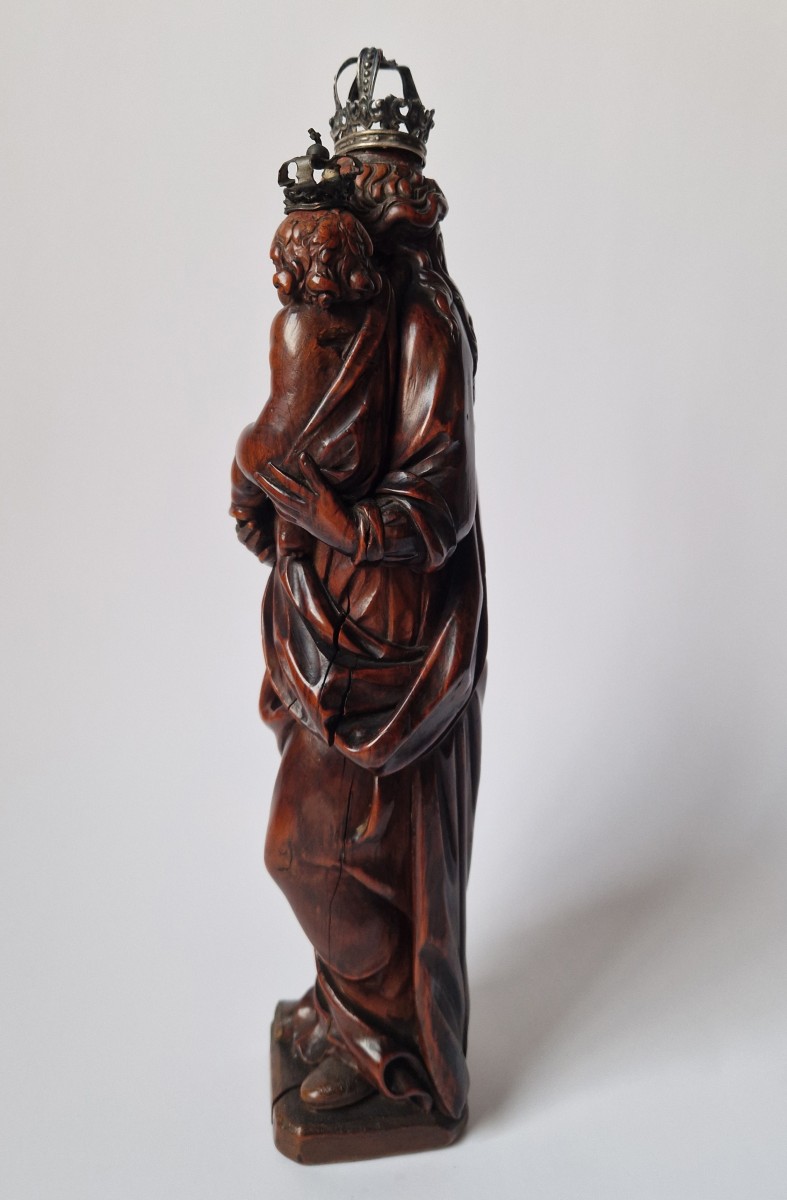 Magnifique sculpture en buis représentant la Vierge à l'Enfant, probablement réalisée à Malines ou ailleurs en Flandre vers 1600-1650 et destinée à la dévotion privée. La conservation des couronnes en métal est exceptionnelle.
