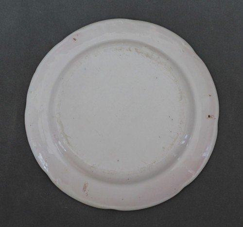 Assiette à bord mouvementé en faïence des Islettes à décor polychrome au centre d'une femme assise avec un jeune enfant sur les genoux sur une terrasse herbue. Peut-être "la nourrice". Guirlande en épis sur l'aile, filet bleu sur le marli, rouge sur le bord.