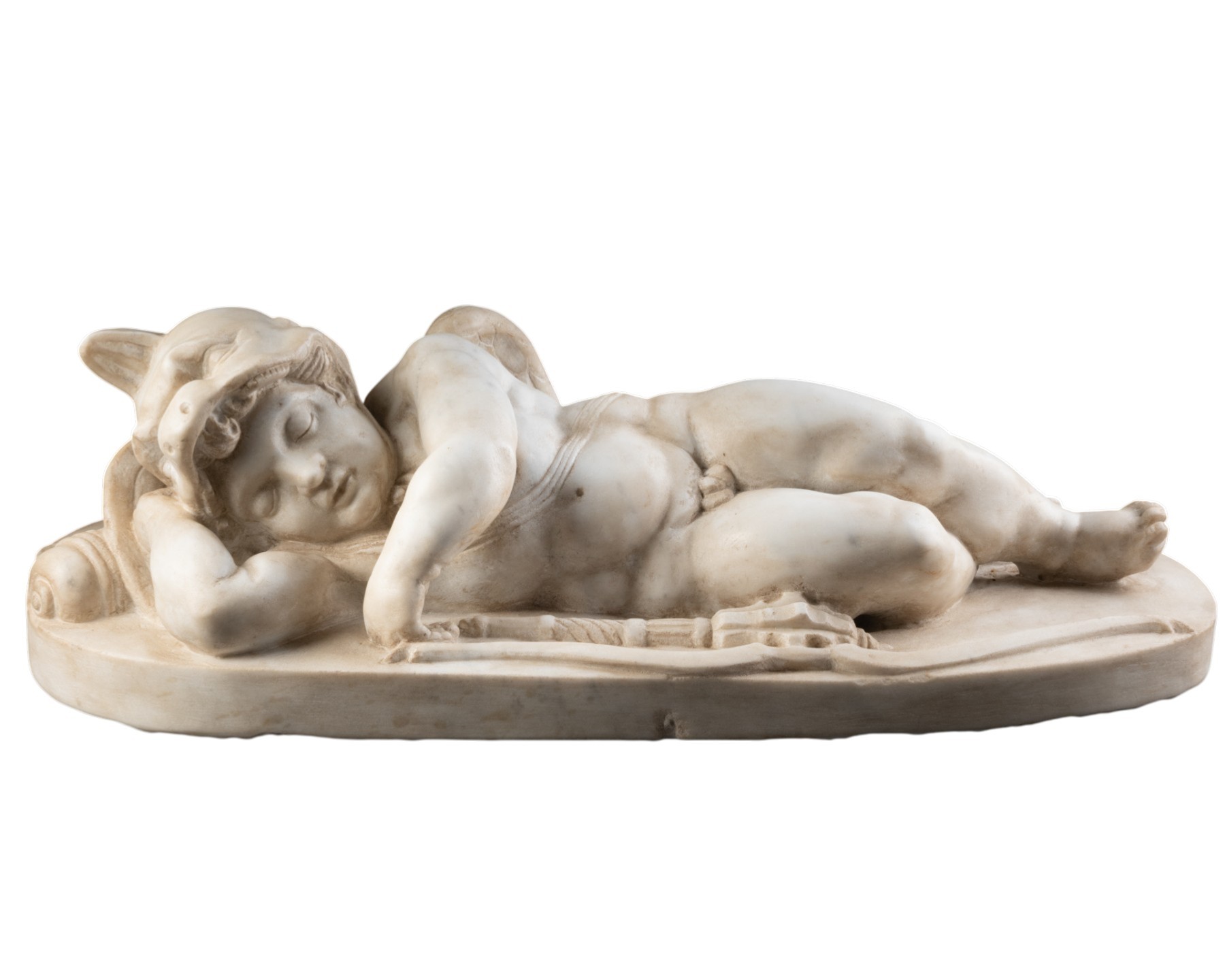 Notre sculpture est précisément en relation directe avec un autre Cupidon endormi qui est conservé aujourd’hui au musée archéologique de Turin. Attribué alternativement par le passé à Michel-Ange (1475-1654) ou à Tommaso della Porta (vers 1546-1606), sculpteur actif dans l'entourage de Guglielmo della Porta (1515-1577), l’œuvre, très admirée par Vasari, serait issue des collections de la maison de Savoie. Tel un effet miroir, notre marbre et celui de Turin se correspondent presque parfaitement. Répondant à un même modèle d’inspiration antique, nos sculptures jumelles ont probablement été réalisées par le même artiste ...
