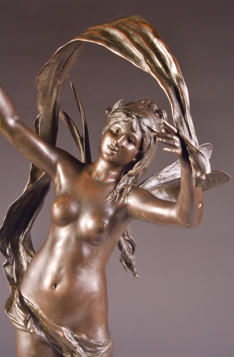 Auguste Moreau (1834-1917), une sculpture nue en bronze patiné rare et extra ordinaire (110 cm) de Vénus avec un dauphin à ses pieds.